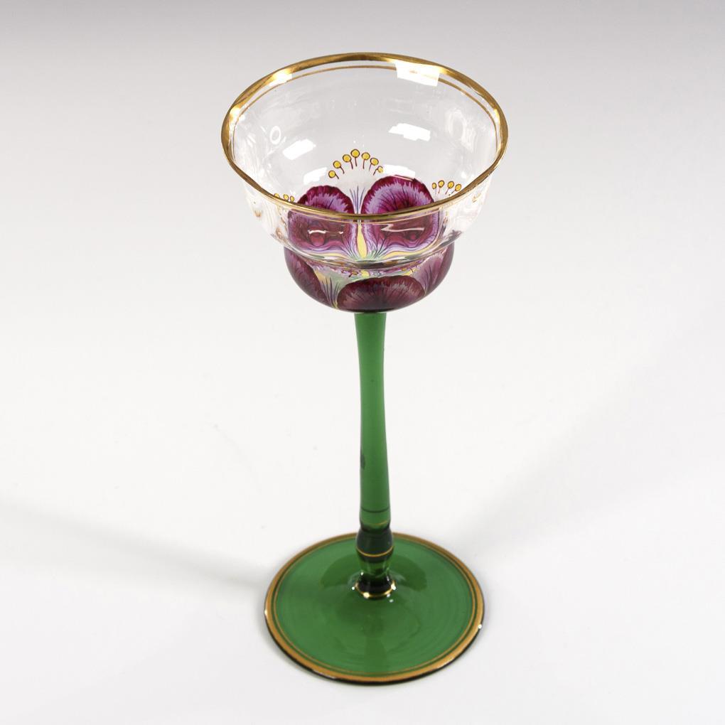 Südweinglas mit glockenförmiger, längsoptischer Kuppa aus farblosem Glas, Stängel und Rundfuß aus grünem Glas. Der Kuppaansatz in Transparentemail bemalt mit einer fünfblättrigen, purpurfarbenen Blüte, Goldrand.