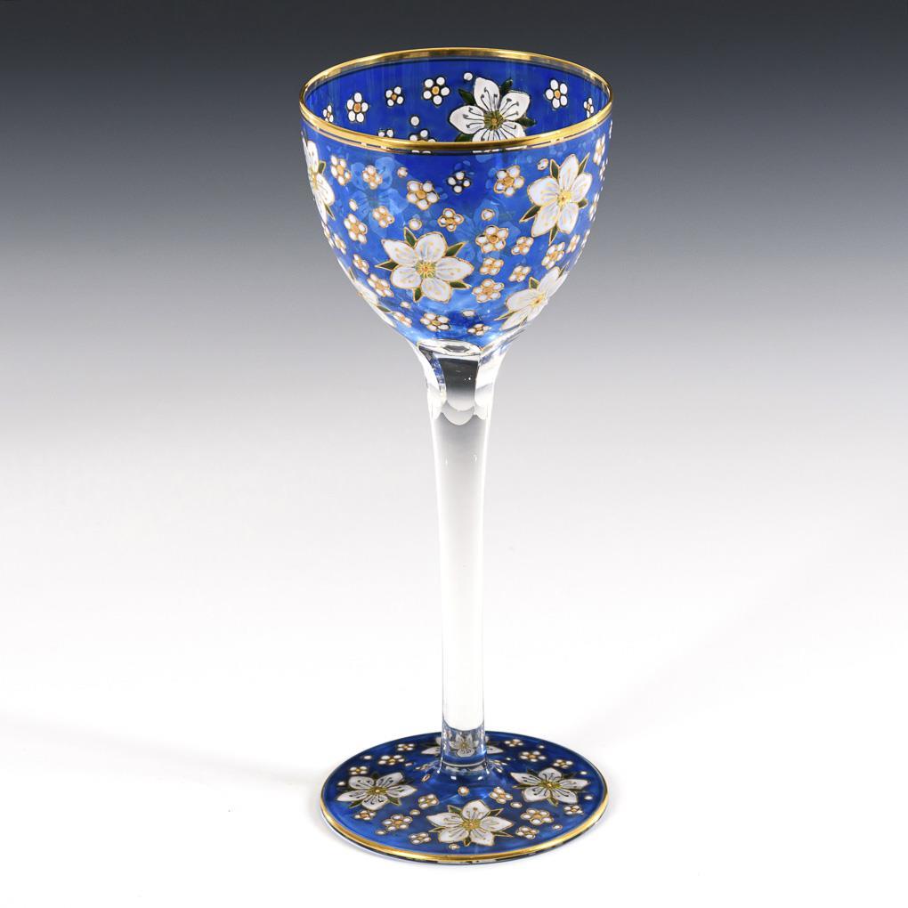 Form Nr. "572". Halbovoide, am Ansatz sechsfach facettierte Kuppa, runder Stängel, Rundfuß. Auf Kuppa und Fuß emailgemalter blauer Fond mit weißen, goldkonturierten Blüten.