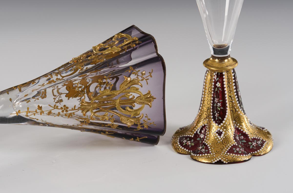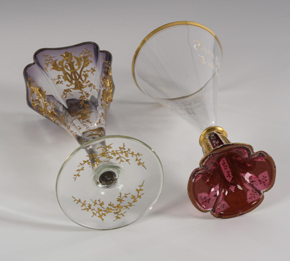 1x um 1880, hergestellt für den amerikanischen Markt: konische Kuppa aus farblosem Glas, Tatzenfuß mit rotem Unterfang mit reicher Gold- und Emailstaffage; auf der Kuppa der Spruch "Then fill a fair and honest cup / And bear it straight to me. Holmes." (aus einem Gedicht von Oliver Wendell Holmes). / 1x signiert Glasfabrik Karlsbad, 1898: quadratisch-konische Kuppa aus farblosem Glas mit violett verlaufendem Überfang und Rundfuß; reiches Reliefgolddekor mit Rocaillen sowie dem schauseitigen Monogramm "CW". 1x goldretuschierte Bestoßung am Fußrand, 1x kleine Bestoßung am Mündungsrand und minimaler Goldabrieb.