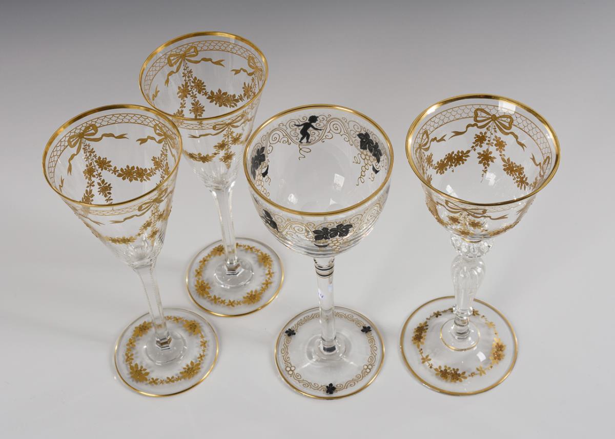 3 Gläser mit reliefgoldgemalten, an Schleifen hängenden Blütenfestons: 2 Sektgläser "Josephine", Entwurf von Siegfried Haertl (1870-1940; Form) und Alexander Pfohl (1894-1953; Dekor), um 1920; 1 Weinglas, Entwurf von Graham & Zenker (Form) und Alexander Pfohl (Dekor), um 1912. / 1 Römer, Entwurf von Siegfried Haertl (Form) und Alexander Pfohl (Dekor), umlaufend ein Fries in Email-, Schwarzlot- und Goldmalerei mit Märchenszenen nach Arnold Busch in Schattenrissmanier.