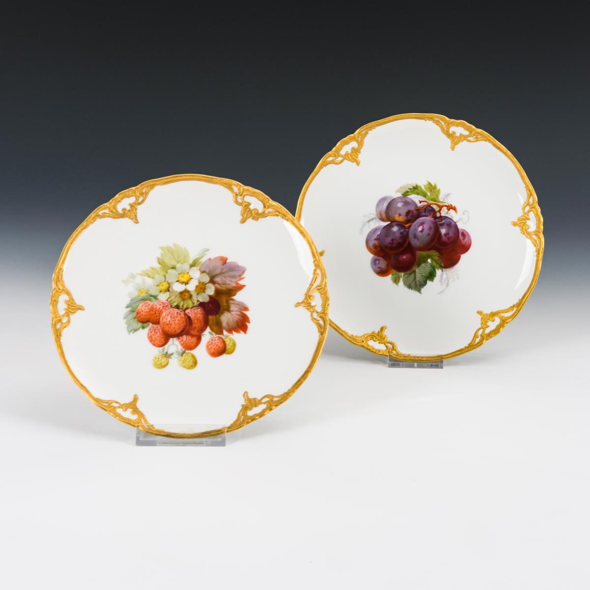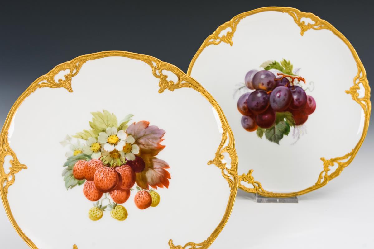 Teller mit goldbronziertem Rocaillereliefrand, im Spiegel Fruchtmalerei: 1x ein Traubenzweig, 1x Erdbeerbukett.