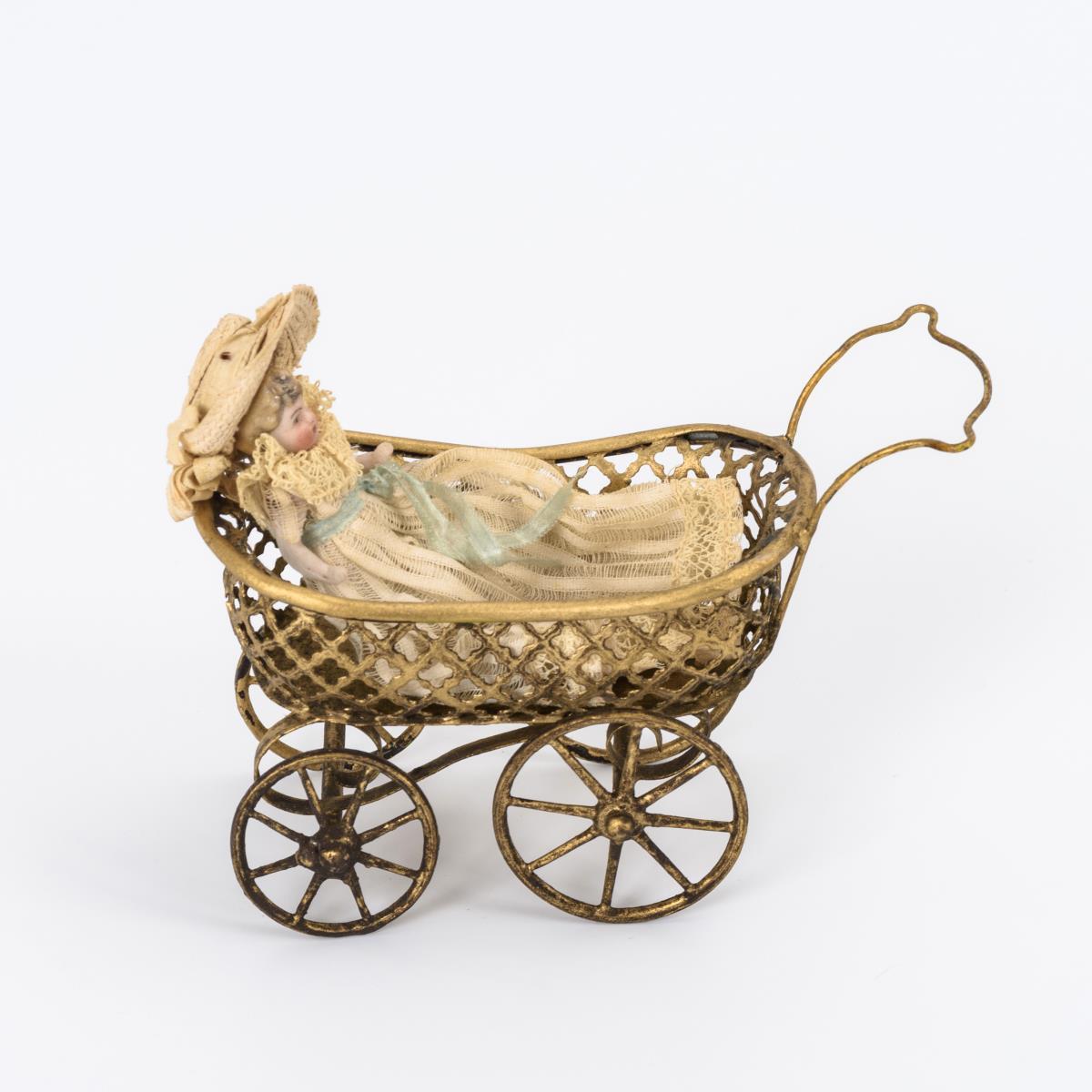 Kleiner Wagen in Korboptik. Dazu Ganzbiskuit-Püppchen in originalem Kleid mit Hut. Wohl nachbronziert, 1 Lötstelle.