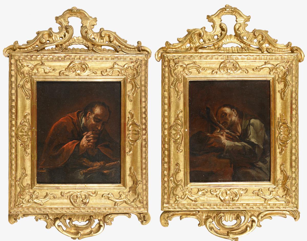 Heiliger, ein Kreuz umarmend sowie vor dem Kruzifix flehend betender Mann. Je Leinwand doubliert.