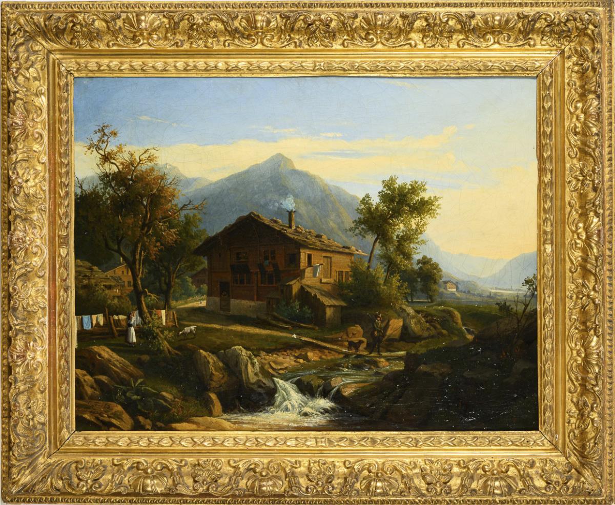 Gebirgsdorf mit Staffagefiguren im Sonnenschein vor den Gipfeln. Zwei kleine restaurierte Stellen mit Hinterklebungen.