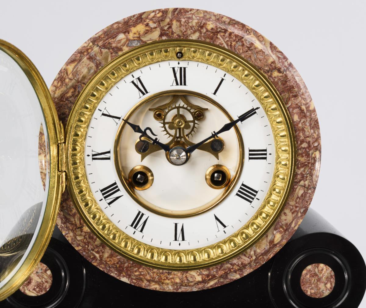 Schwarzer und rot-gelb geäderter Marmor. Uhr H 38 cm, 13 kg. Beisteller H 24 cm, 3,8 kg.