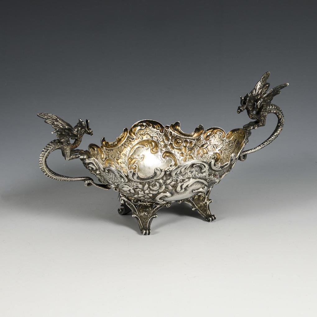 Ovale Silberschale mit Drachenhenkeln.