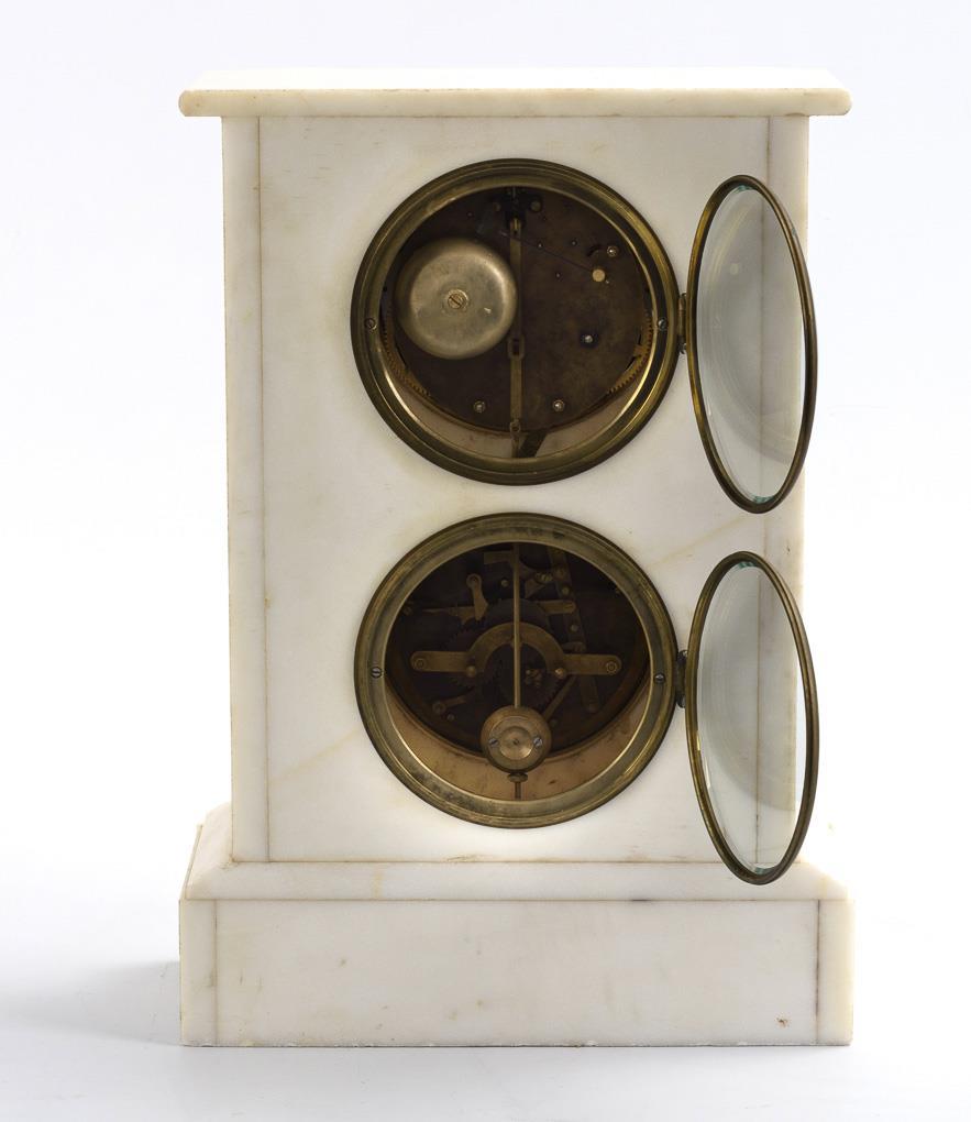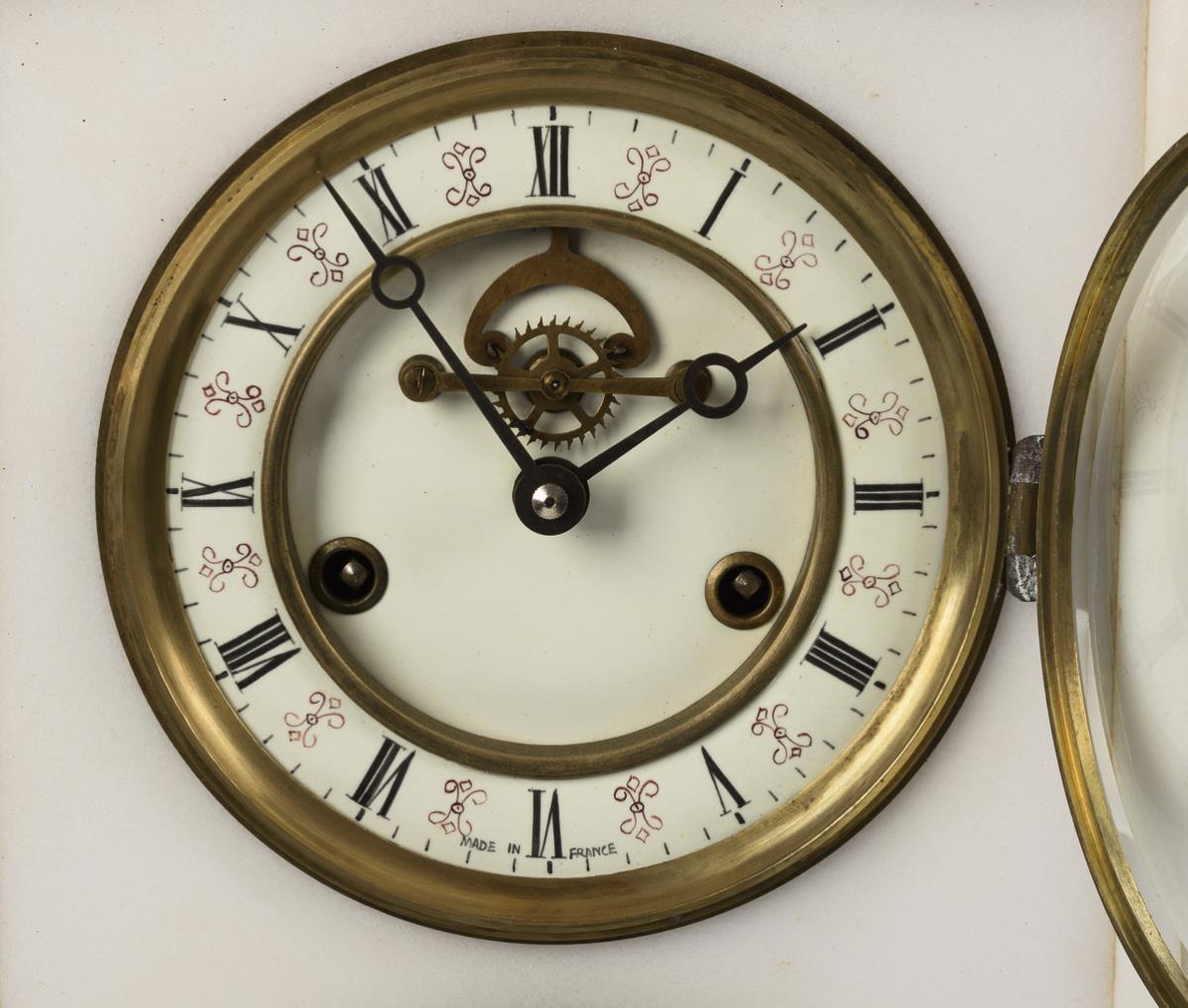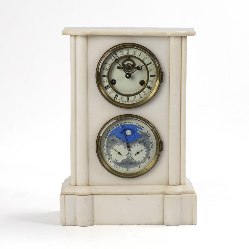 Weiße Marmor-Kaminuhr mit Kalendarium.