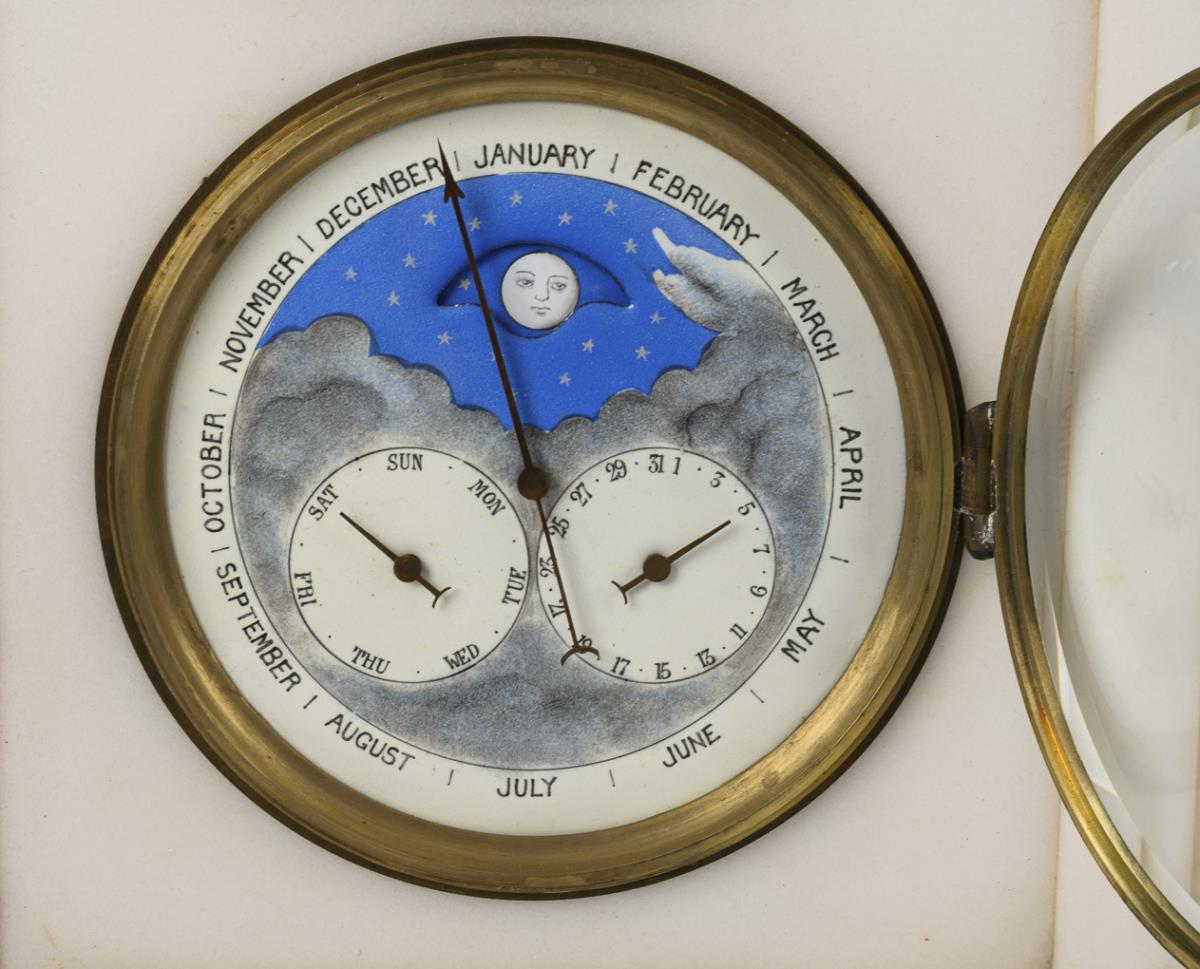 Ungemarktes Werk mit Halbstundenschlag auf Glocke. Läuft kurz an, revisionsbedürftig. 2 Zifferblätter für Uhrzeit und Kalender: oberes Zifferblatt mit römischen Zahlen, Breguet-Zeigern und vertiefter Blattmitte mit Brocot-Hemmung, unteres Zifferblatt mit Mondphase, englischen Monaten, Wochentagen und Datum (ohne Werkantrieb).
