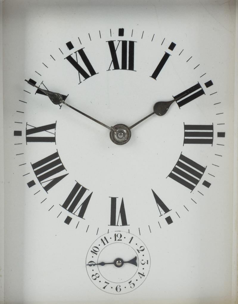 "Made in France" gemarktes Messingplatinenwerk mit oben liegender Unruh, Ankergang, Stunden-/Halbstundenschlag auf Rundgong, Weckschlag auf Rundgong, Schlüsselaufzug. Im Kurzzeittest funktionstüchtig. Weißes Emailzifferblatt mit römischen Zahlen, Minutenkranz, Spade-Zeigern und Hilfszifferblatt für Alarm.
