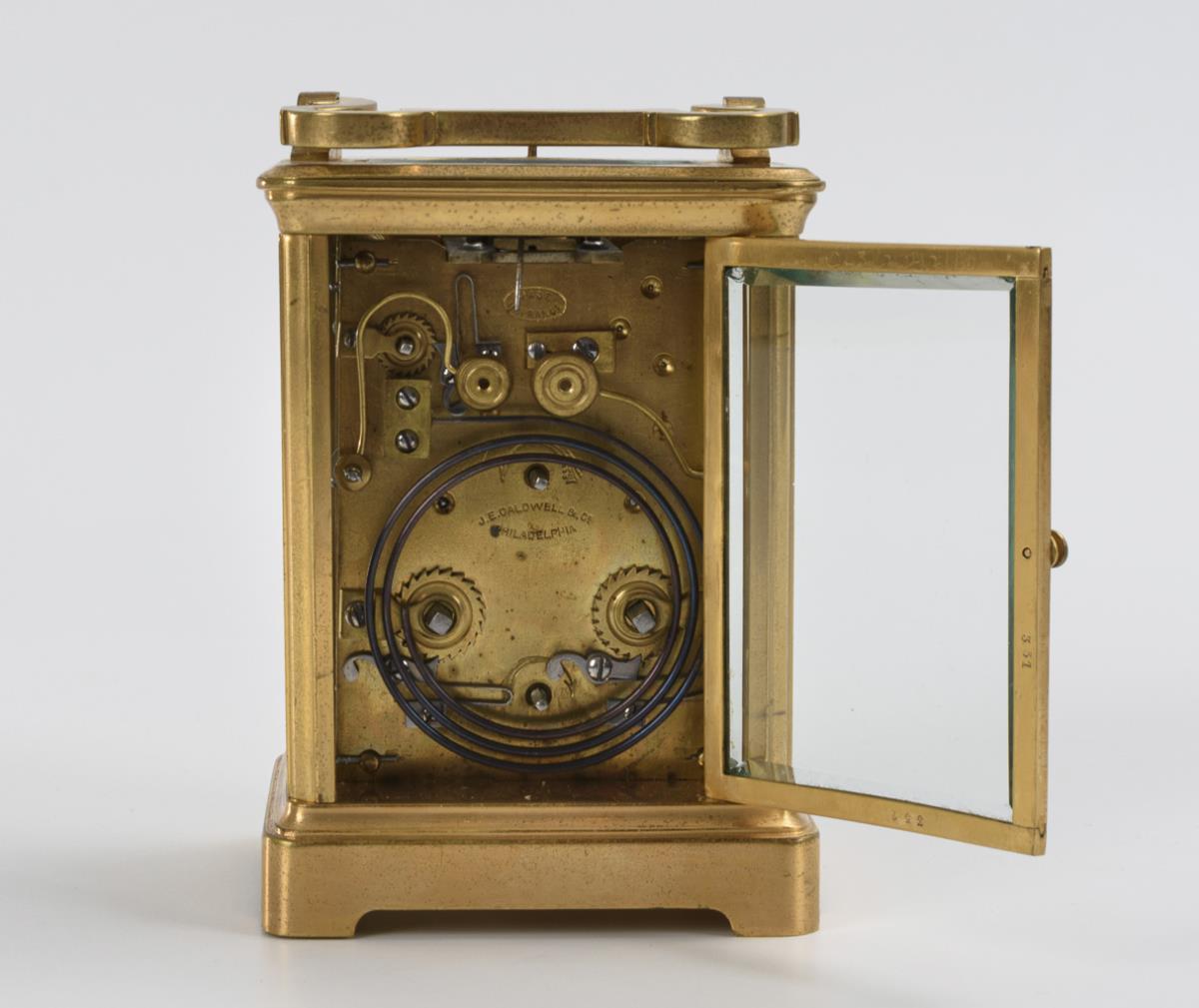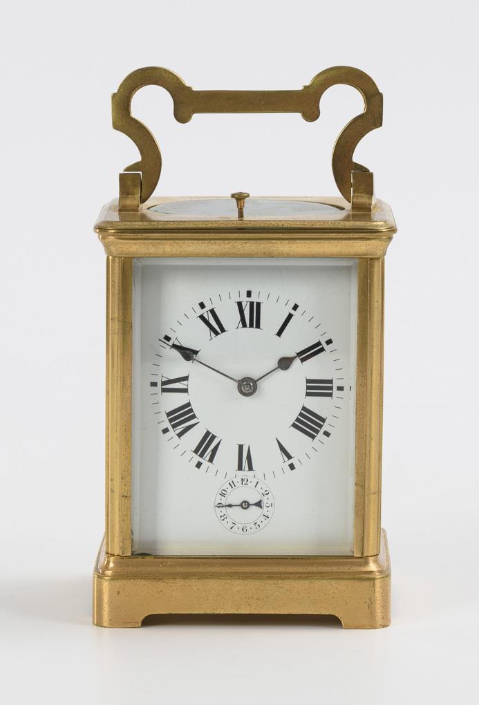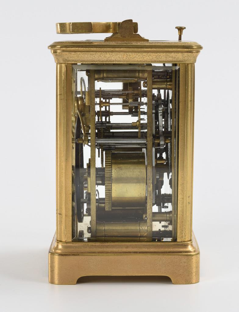 5-seitig facettiert verglastes Messing-Gehäuse mit geschweiftem Bügelgriff. Separater Drücker für Stundenrepetition. Altersspuren, Glas teils gechippt.
