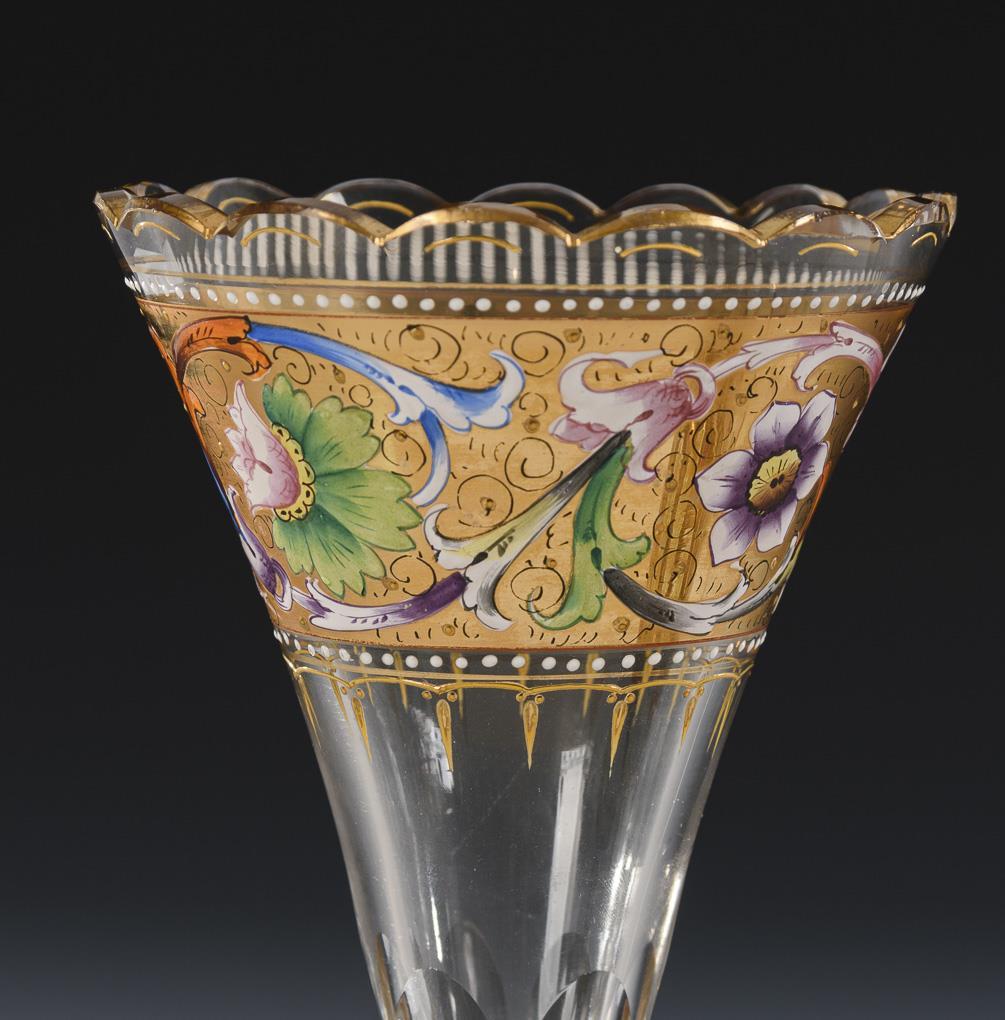 2 JOSEPHINENHÜTTE: 1x Weinglas "Jodhpur", Entwurf von Rudolf Wille, 1912-1925, Form-Nr. 623/6 (H 18 cm); 1x Likörglas mit bauchiger Kuppa und Trompetenfuß mit Wellenrand, um 1905, Service "1300", Formentwurf von Arthur Gerlach, vor 1897, Malerei Hanney-Werkstatt (H 12 cm). / 1x HARRACH: schweres Pokalglas mit gewelltem Rand, facettiertem Schaft und Rundfuß, mit einem breiten Goldfondband mit polychrom emailgemalten Blüten (H 22 cm). Goldretuschierte Bestoßung am Fuß des Likörglases, Mündungsrand des Pokalglases goldberieben und mit 3 minimalen Bestoßungen.