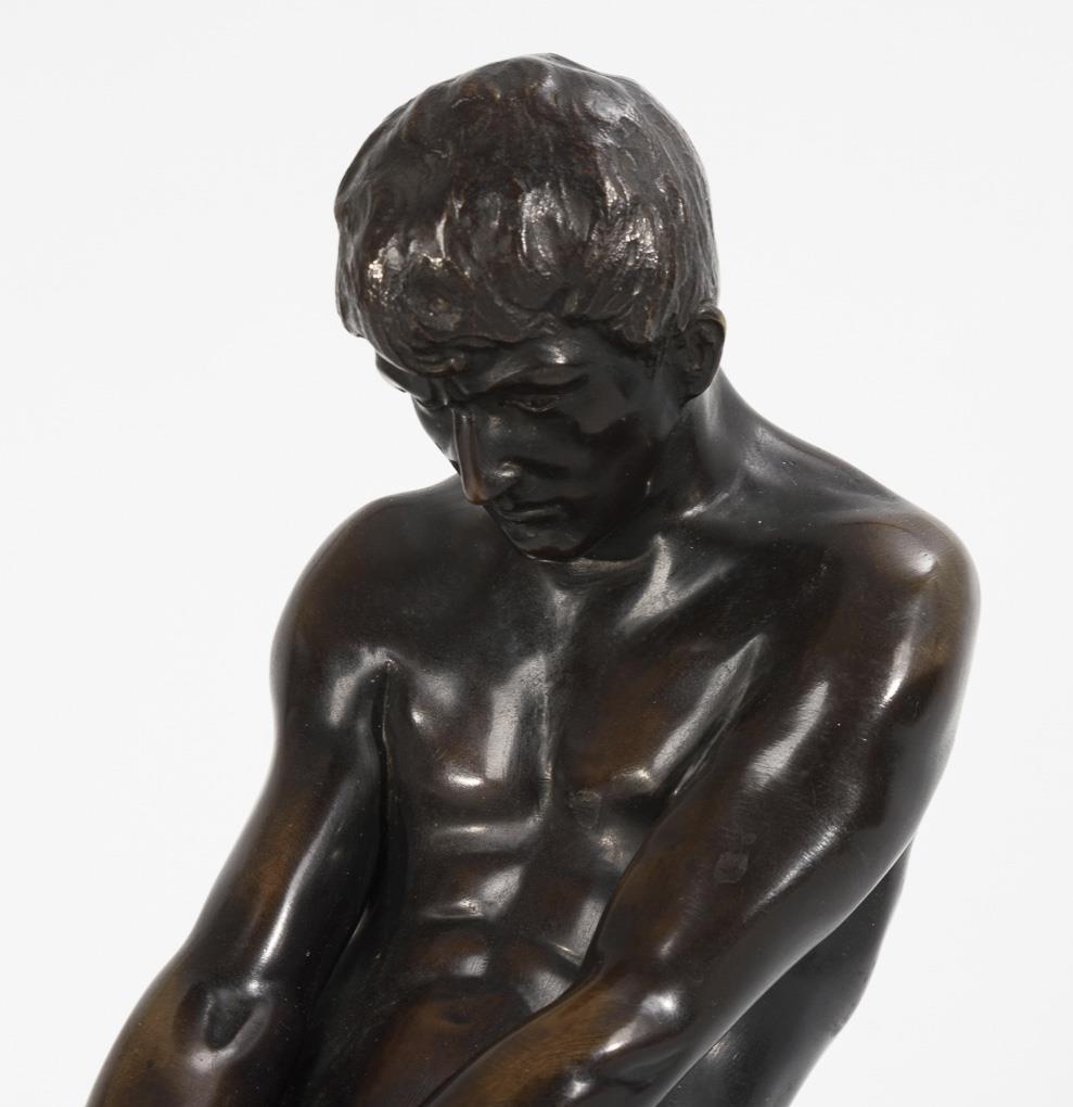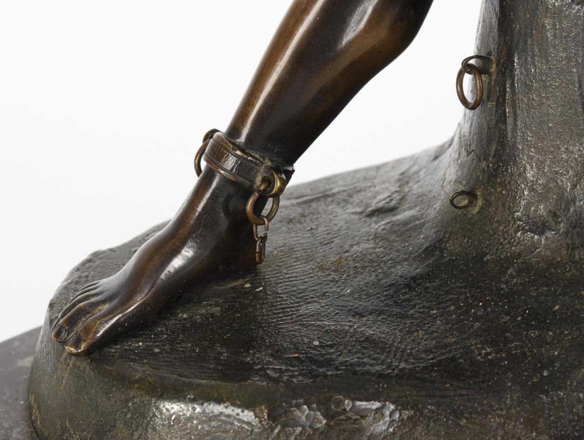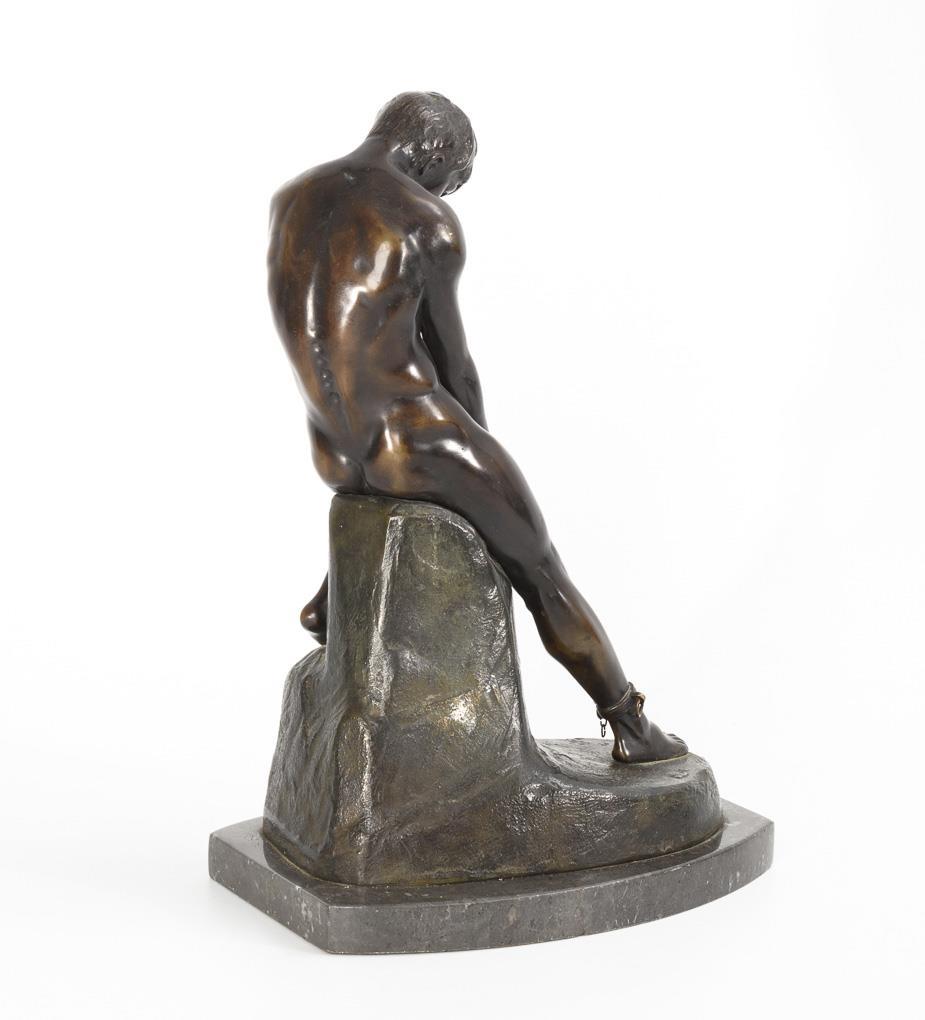 Wohl Prometheus, der auf dem Felsen sitzend vergeblich an seiner Kette zieht. Geringe Kratzer an einer Schulter, heller Fleck am Fels, Ketten fehlen.