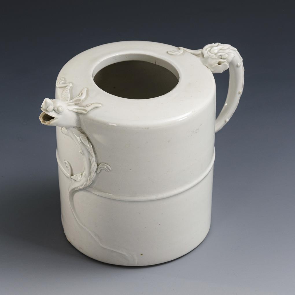 Zylinderkännchen mit einem fein ausgeformten Henkel in Form einer Echse. Deckel ergänzt, Schneppe bestoßen.