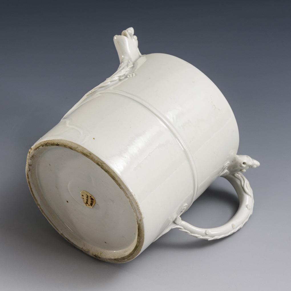 Zylinderkännchen mit einem fein ausgeformten Henkel in Form einer Echse. Deckel ergänzt, Schneppe bestoßen.