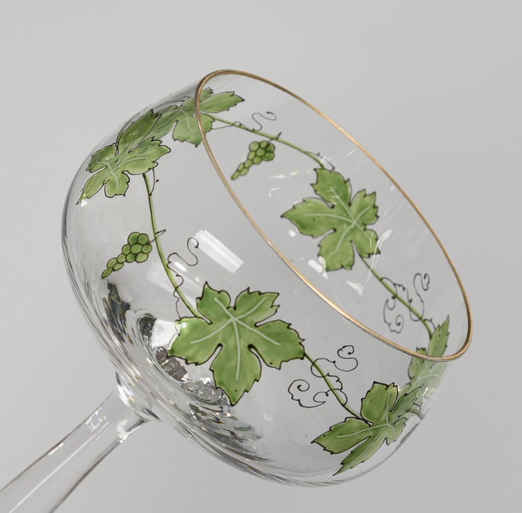 Form-Nr. 1496. Gedrückt gebauchte Kuppa, mittig verdickter Stängel, Rundfuß. Transparent emailbemalt mit einer umlaufenden Weinranke. 1 Glas mit beriebenem Goldrand und kleiner Farbabweichung im Dekor.