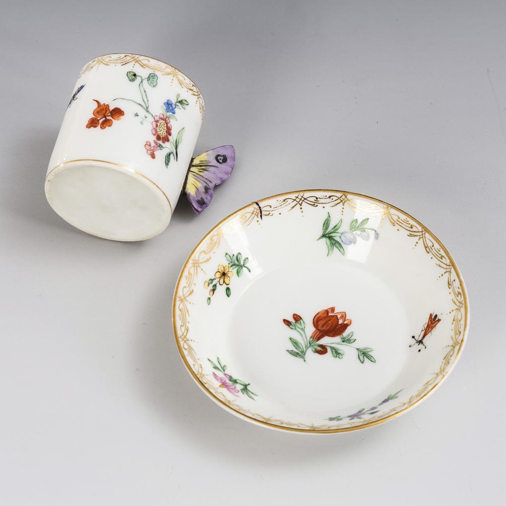 Zylindertässchen mit Blumenmalerei und einem Henkel in Form eines Schmetterlings. Haarriss in 2 Tassen, partiell Flügelspitzen minimal bestoßen und partiell minimaler Goldabrieb.