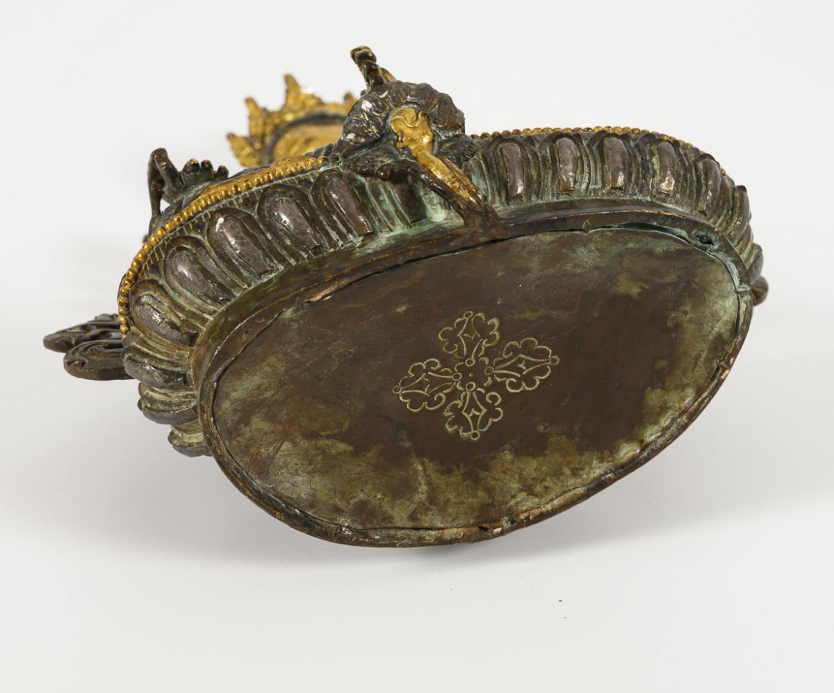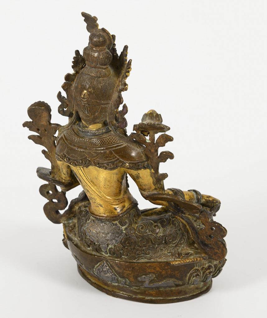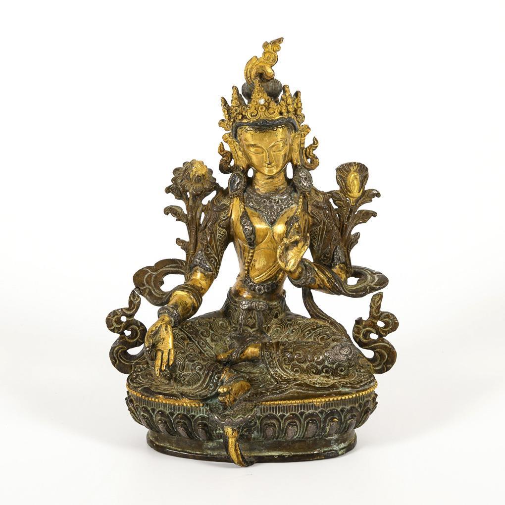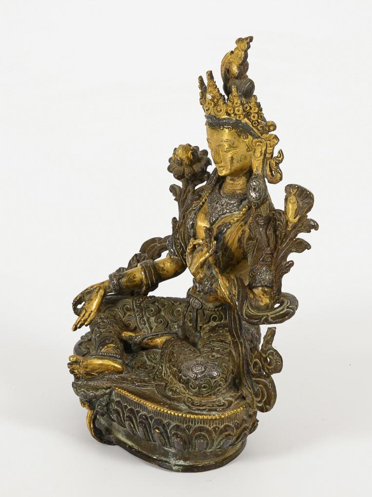 Sehr schön ausgearbeitete Figur einer sitzenden Frau, mit einem Fuß auf einer Lotosblüte. Reich strukturierte Oberfläche, wohl aus verschiedenen Metallen, teils vergoldet, Boden geschlossen. Steinbesatz fehlt komplett bis auf einen Strassstein in der Krone.