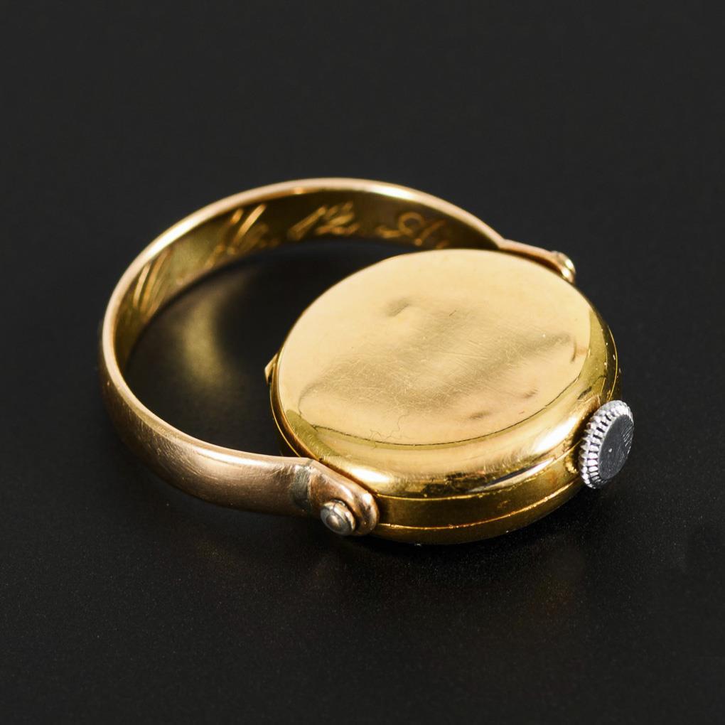 Gelbgolduhr 18 k gestempelt. Roségoldschiene 560 gestempelt. Punze ungedeutet. Uhr Ø 1,8 cm. Ringgröße 51. 8,7 g.