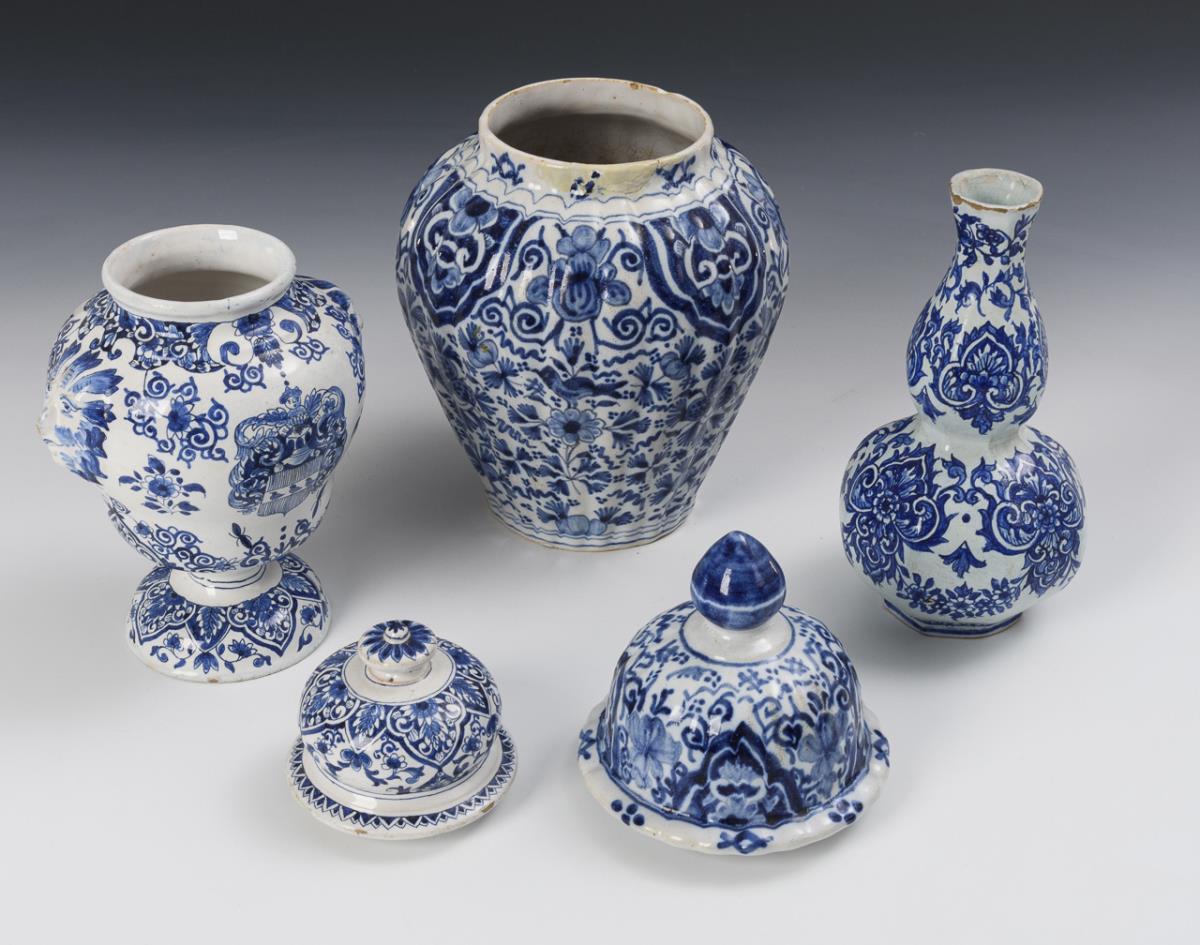 3 Delfter Fayencen: 2 Deckelvasen und 1 Kürbisvase.