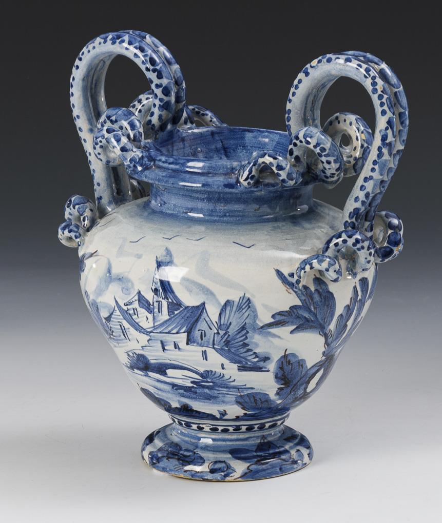 Balustervase mit stark hochgezogenen Doppelschlangenhenkeln, auf Rundfuß. Schauseitig eine thronende Antikenfigur mit Speer, verso Architektur in Landschaft. Partiell leicht bestoßen, 1 Henkelansatz leicht rissig.