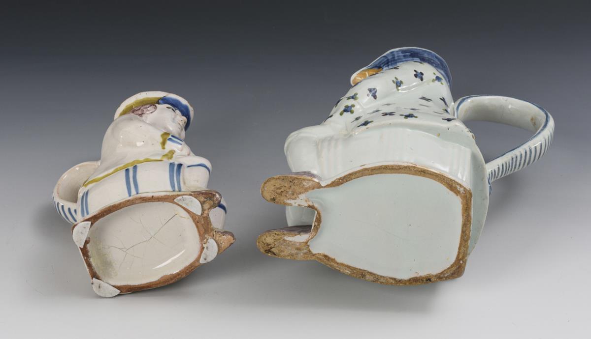 2 Kannen in Form von sitzenden Herren, mit strichverzierten Bandhenkeln. Restauriert, mit Defekten.