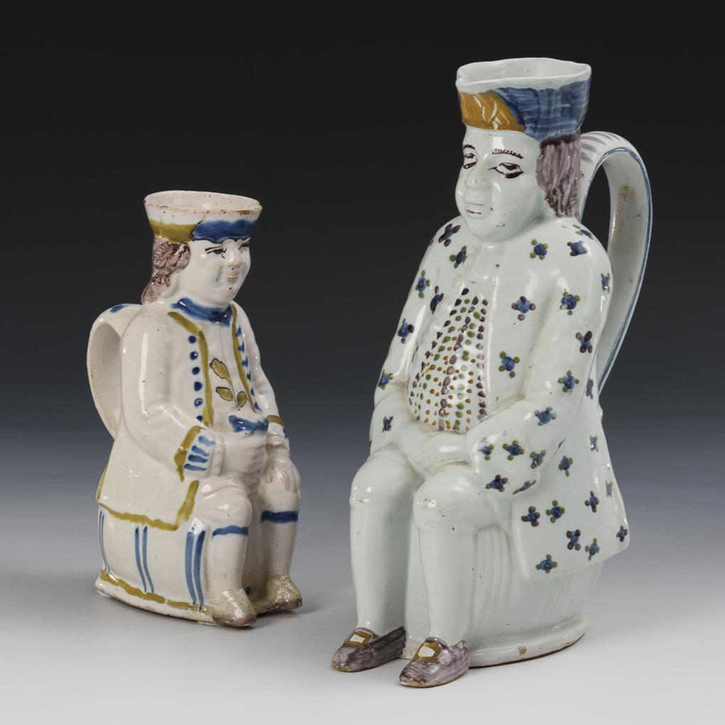 2 Kannen in Form von sitzenden Herren, mit strichverzierten Bandhenkeln. Restauriert, mit Defekten.