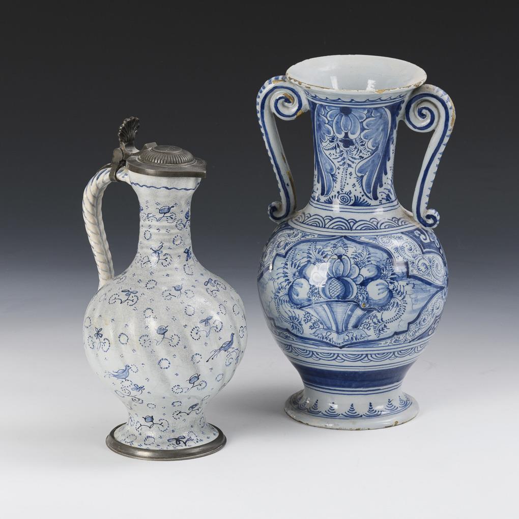 Barocke Fayence-Amphorenvase und Fayence-Enghalskrug.