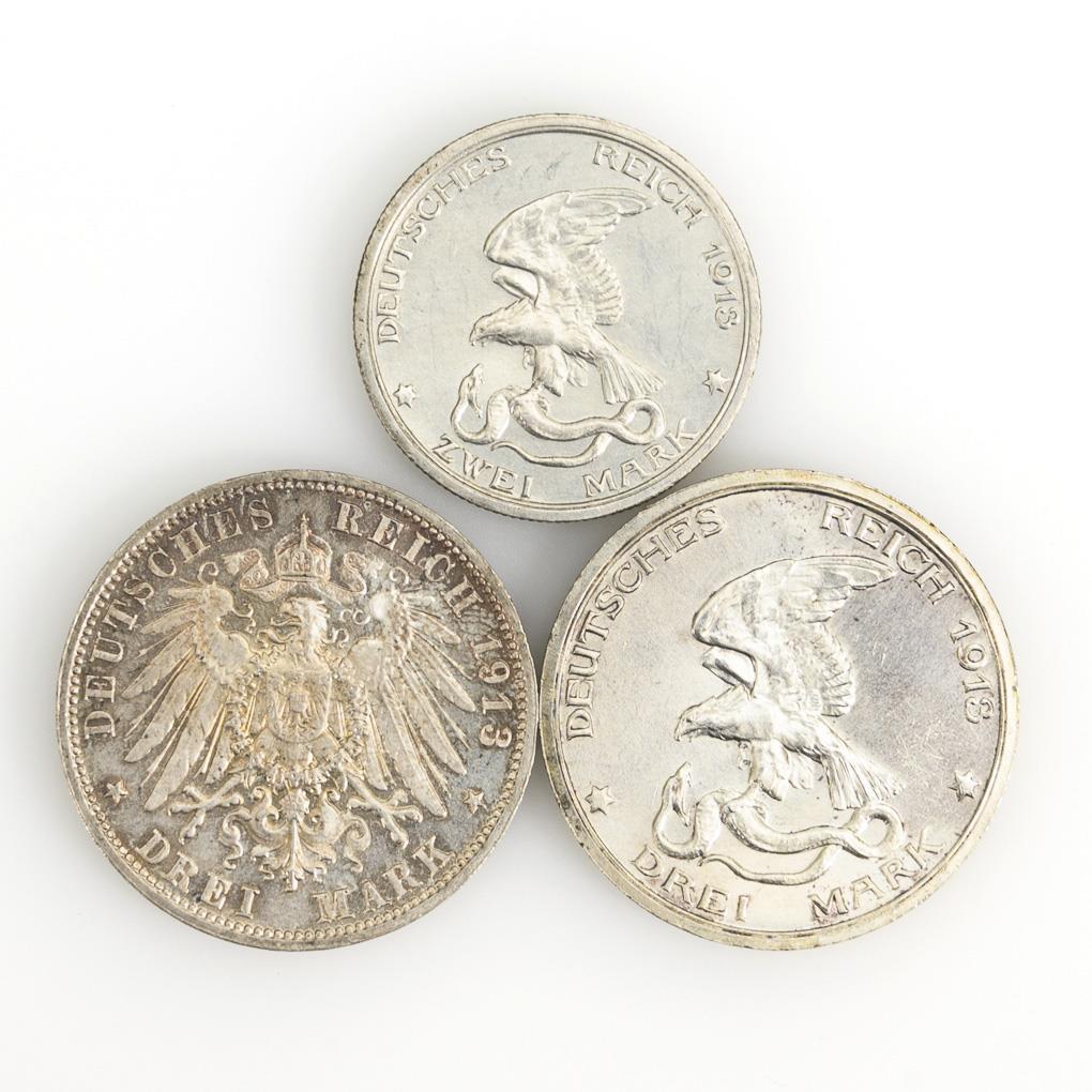 3 Mark 100 Jahre Gedenkmünze Völkerschlacht. Avers Völkerschlachtdenkmal mit Daten und Münzzeichen E, revers Reichsadler. / 3 bzw 2 Mark 100 Jahre Befreiungskriege. Avers König zu Pferd und Fußvolk, Legende "Der König rief und alle kamen. Mit Gott für König und Vaterland 17.3.1813". Je 1913. Zustand: sehr schön bis vorzüglich.