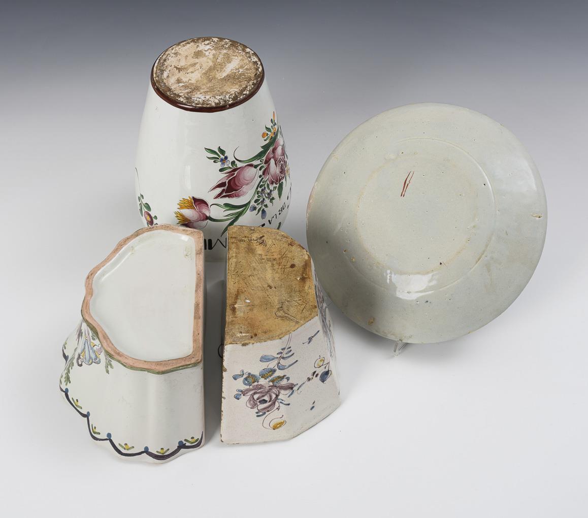 Balustergefäß mit Blumenmalerei, gedrechselter Holzdeckel (H 24 cm). 2 Steckvasen für die Wand, 1x gerippte Wandung mit Figurenmalerei, 1x geschrägte Ecken (H ca. 10,5 cm). Runder Teller mit Weintrauben (Ø 22 cm). Leichte Alters- und Gebrauchsspuren, partiell Defekte, Tabaktopf am Rand restauriert.