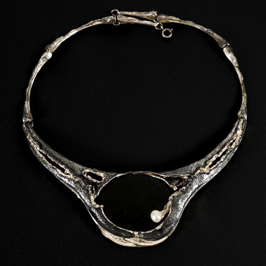 Strukturiertes Collier mit gefasster Onyxscheibe und Zuchtperle. Ringfederschließe.