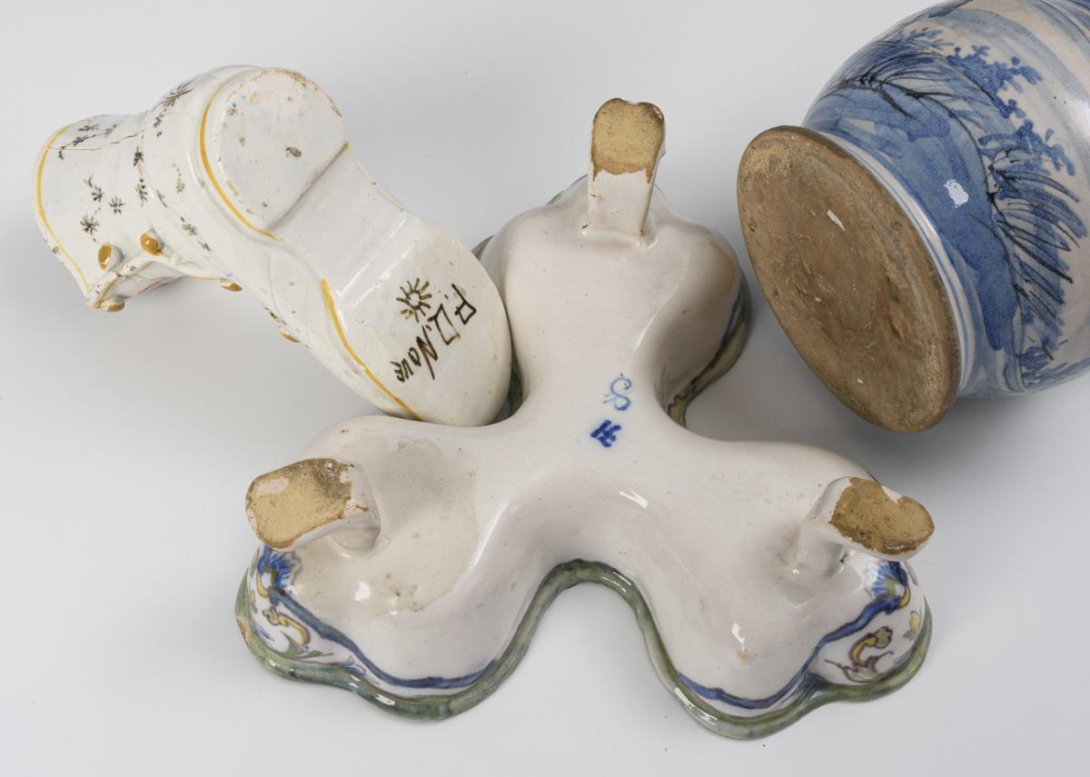 3 Fayencen: Albarello, Dreipassschale und Schuh.