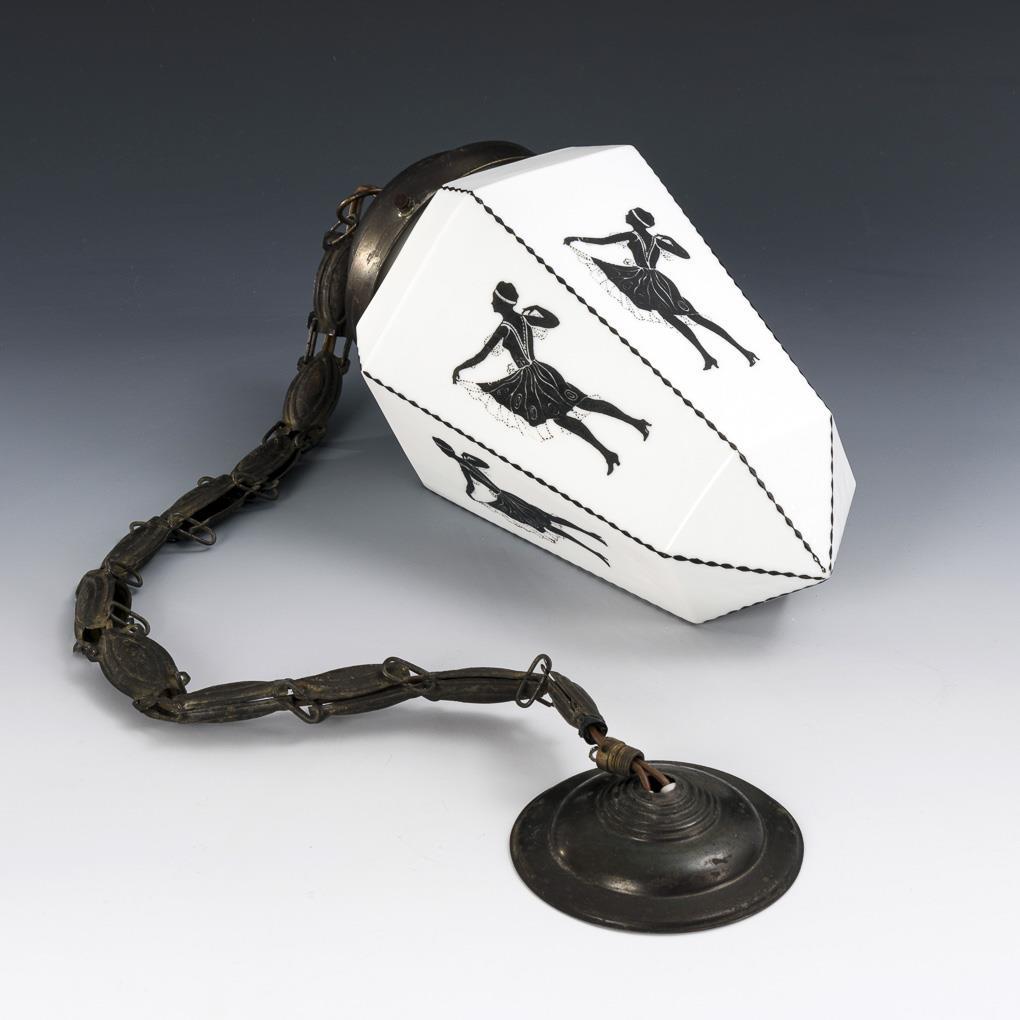 Am Baldachin und geprägten Kettengliedern hängende Lampe mit spitz zulaufendem, 6-eckigem Glasschirm; auf allen Seiten die gleiche Tänzerin. Baldachin lose, Hängehaken fehlt, Metall leicht verschmutzt.