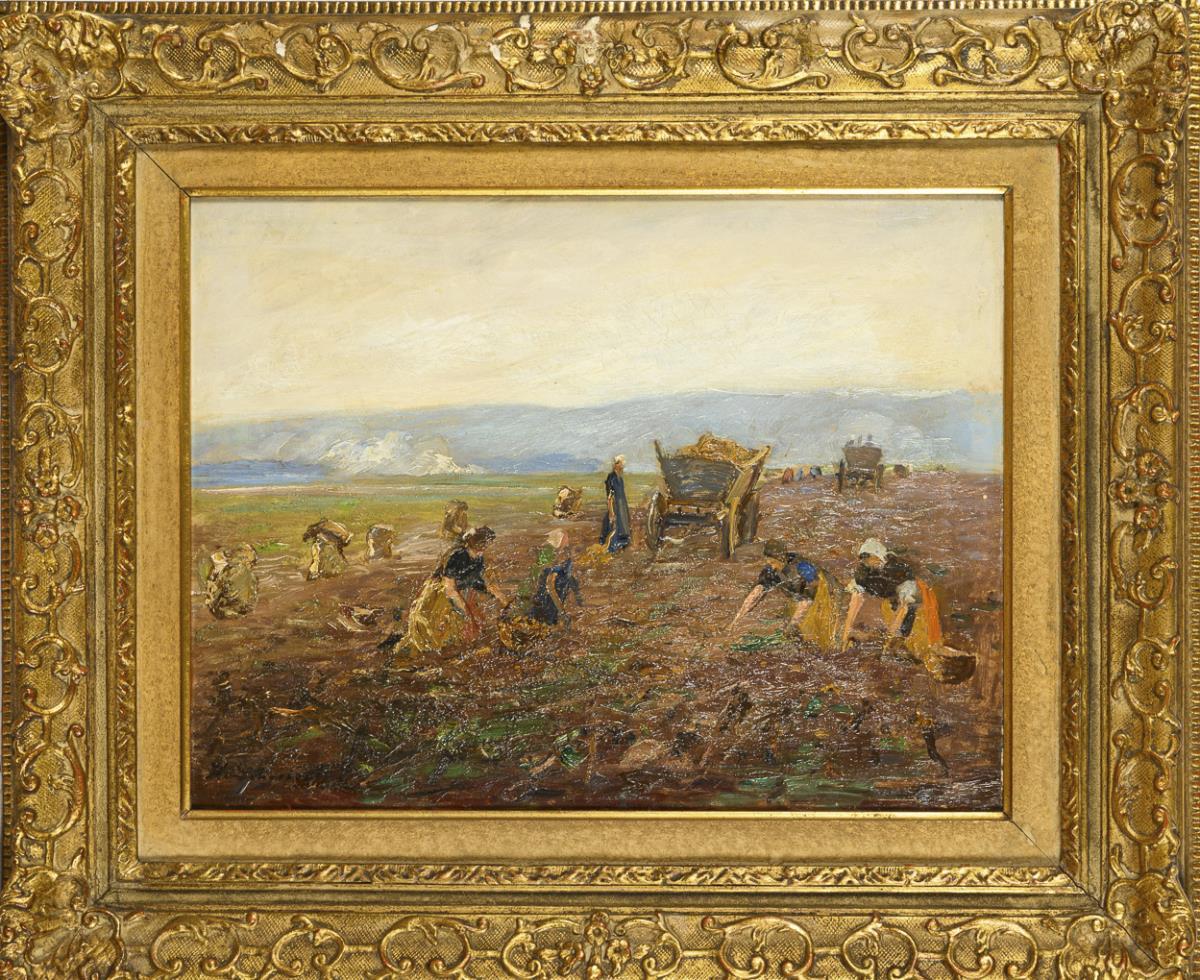 Die Dorfbewohner auf dem Feld beim Ernten der Kartoffeln unter grauem Himmel. Leichte Altersspuren.