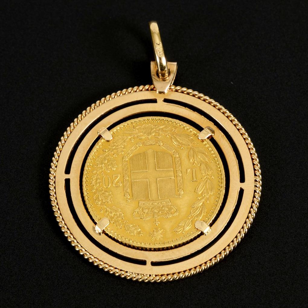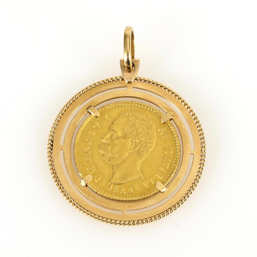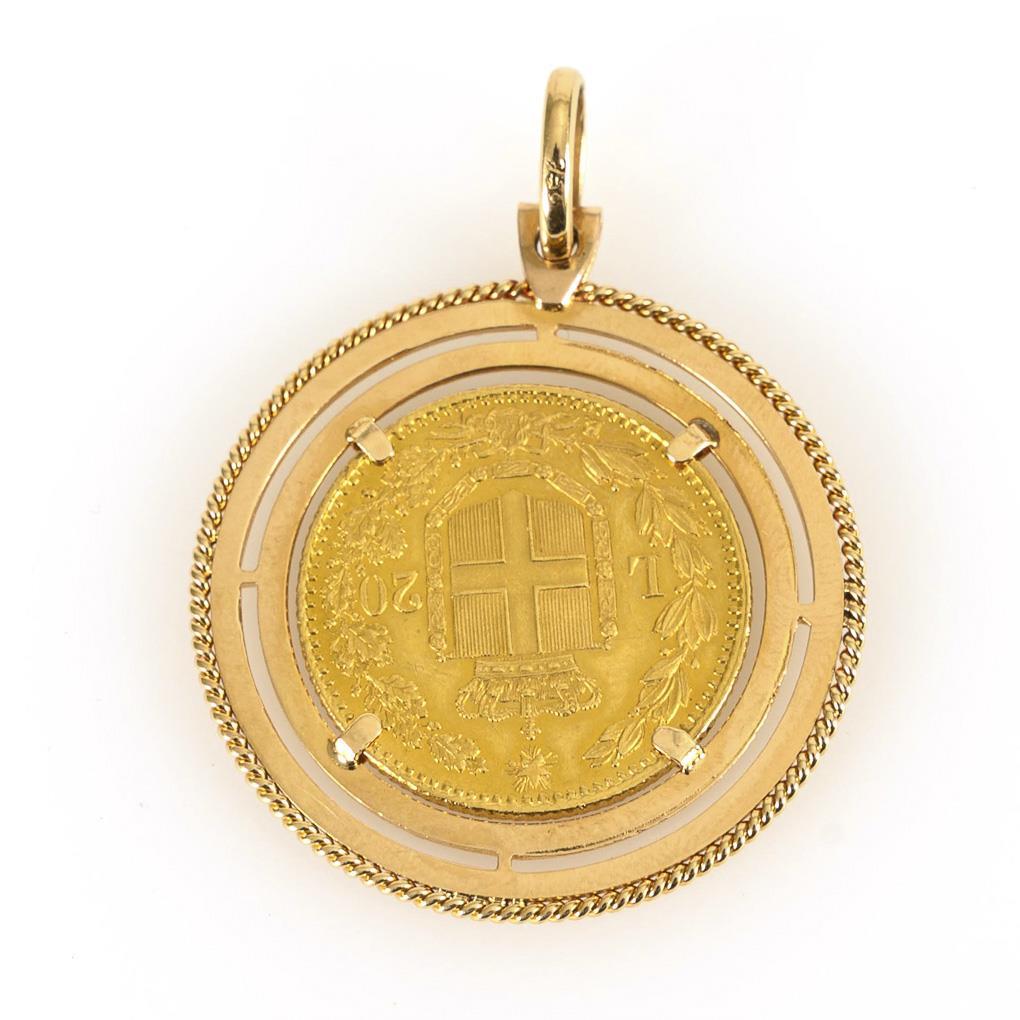 Münzgold 900. Rahmen Gelbgold 750, an Öse gestempelt. Münze Ø 2,1 cm. Total 3,2 cm. Total 10,6 g. Münze 6,45 g.