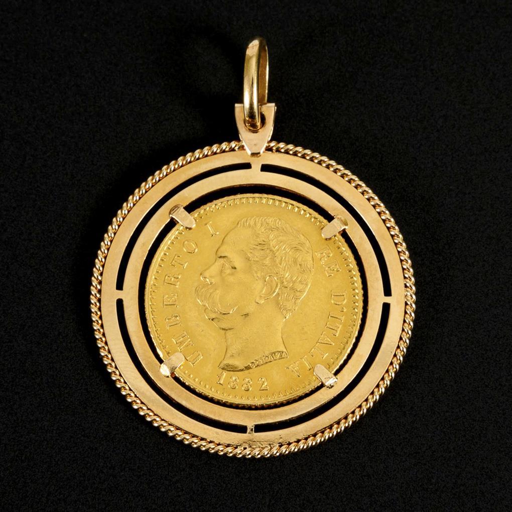 20 Lire-Münze (Umberto I, 1882) krappengefasst in Doppelrahmen mit Kordelrand.
