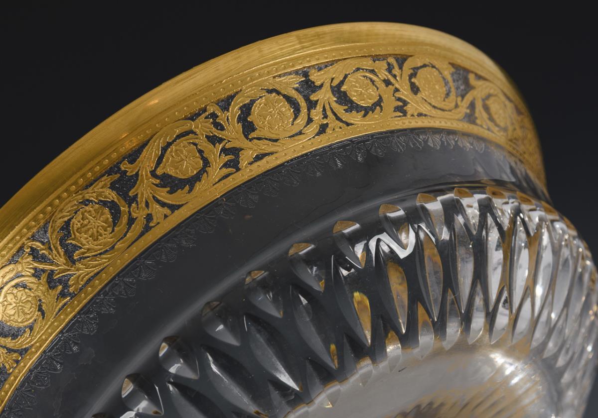 Farbloses Glas, Ätzbordüre. Ø 22,5 cm, H 7,5 cm.