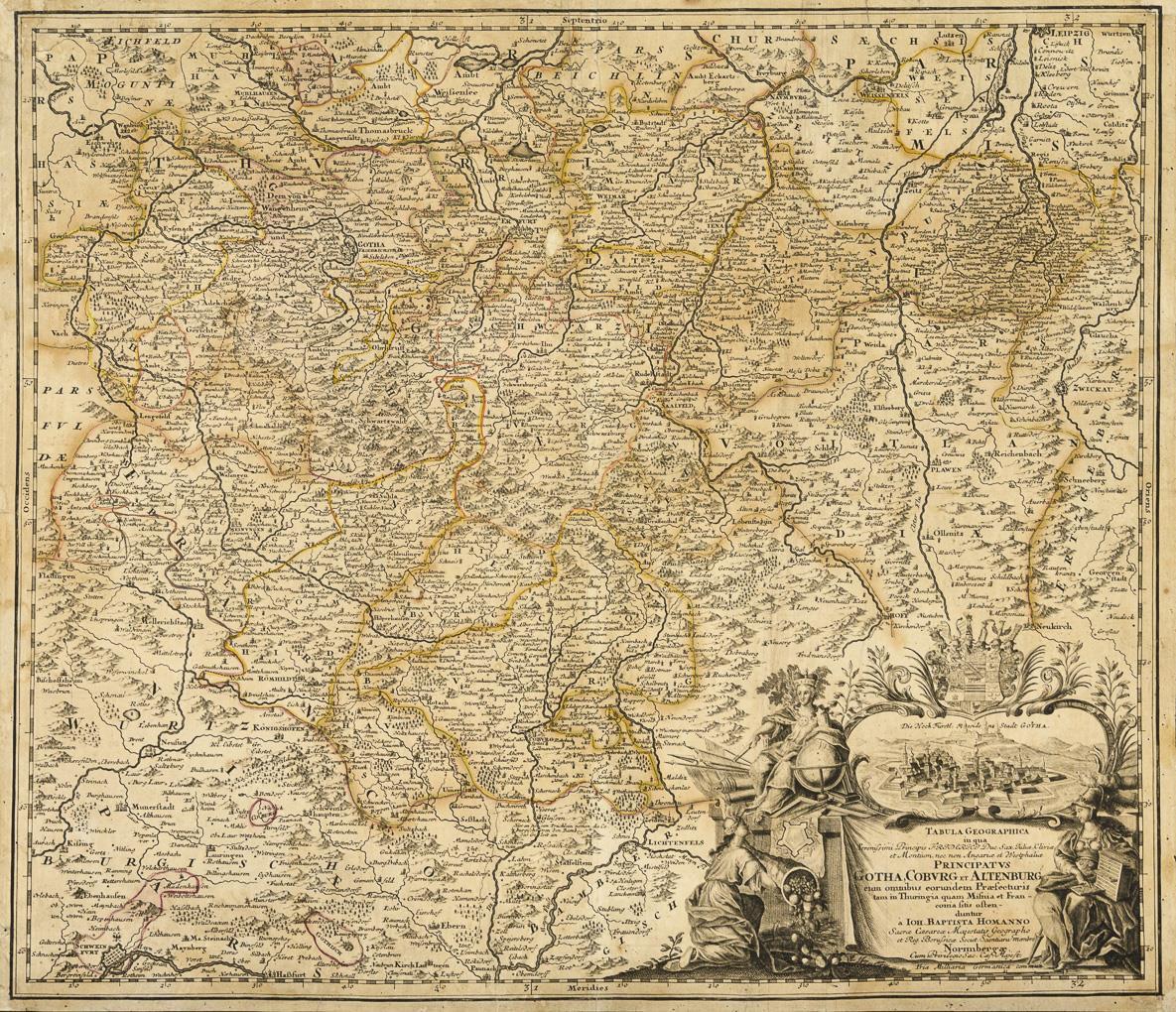 Detailreiche Landkarte der ernestinischen Herzogtümer Sachsen-Gotha-Altenburg und Sachsen-Coburg, mit figürlicher Titelkartusche "Tabula Geographica Principatus Gotha, Coburg, Altenburg", kleine Kartusche mit perspektivischer Ansicht der Stadt Gotha. Blatt mit Wasserflecken und Stockflecken.
