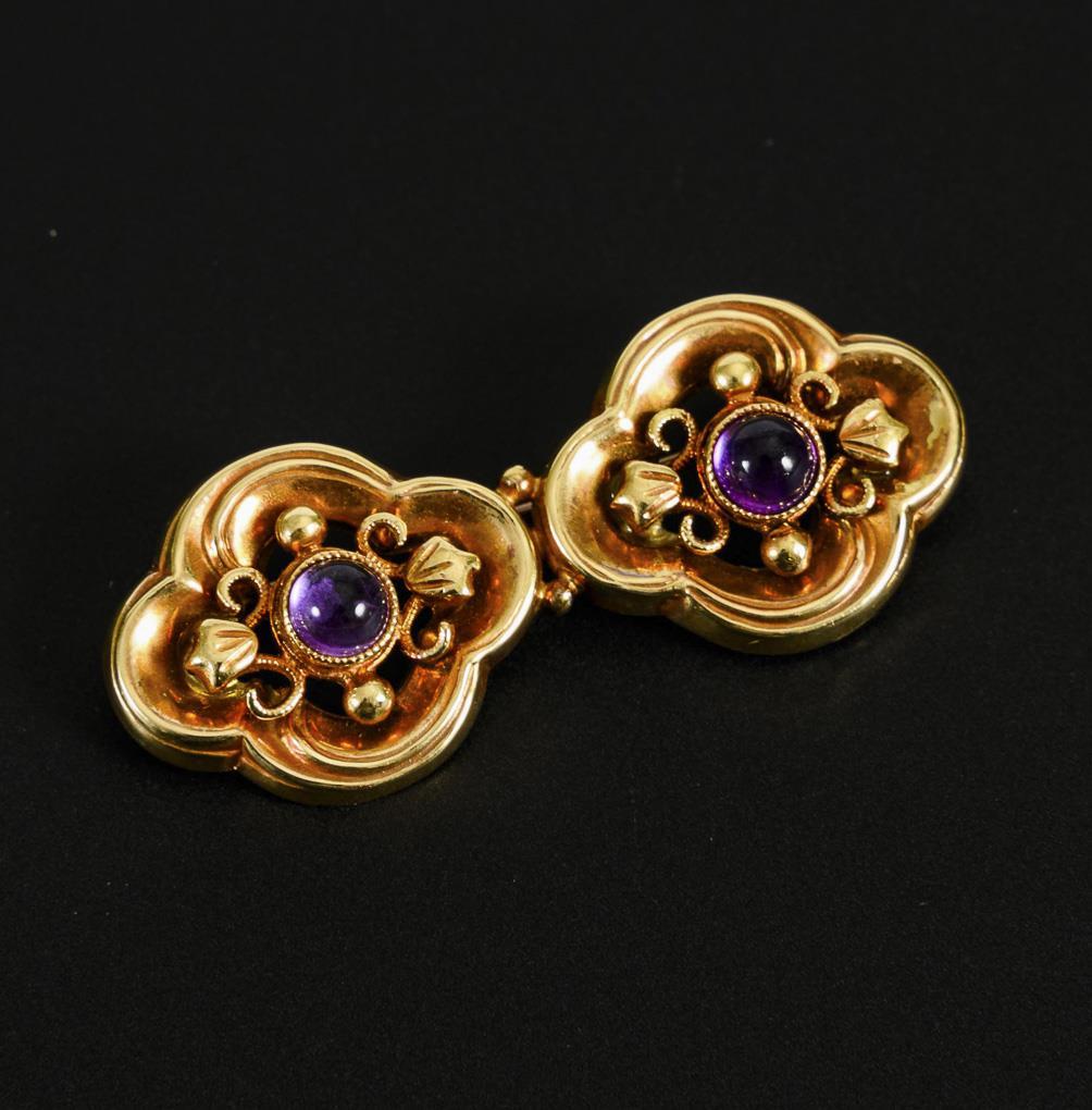 In Hohlform reliefierte Brosche mit 2 zargengefassten Amethystcabochons. Kugelhaken.