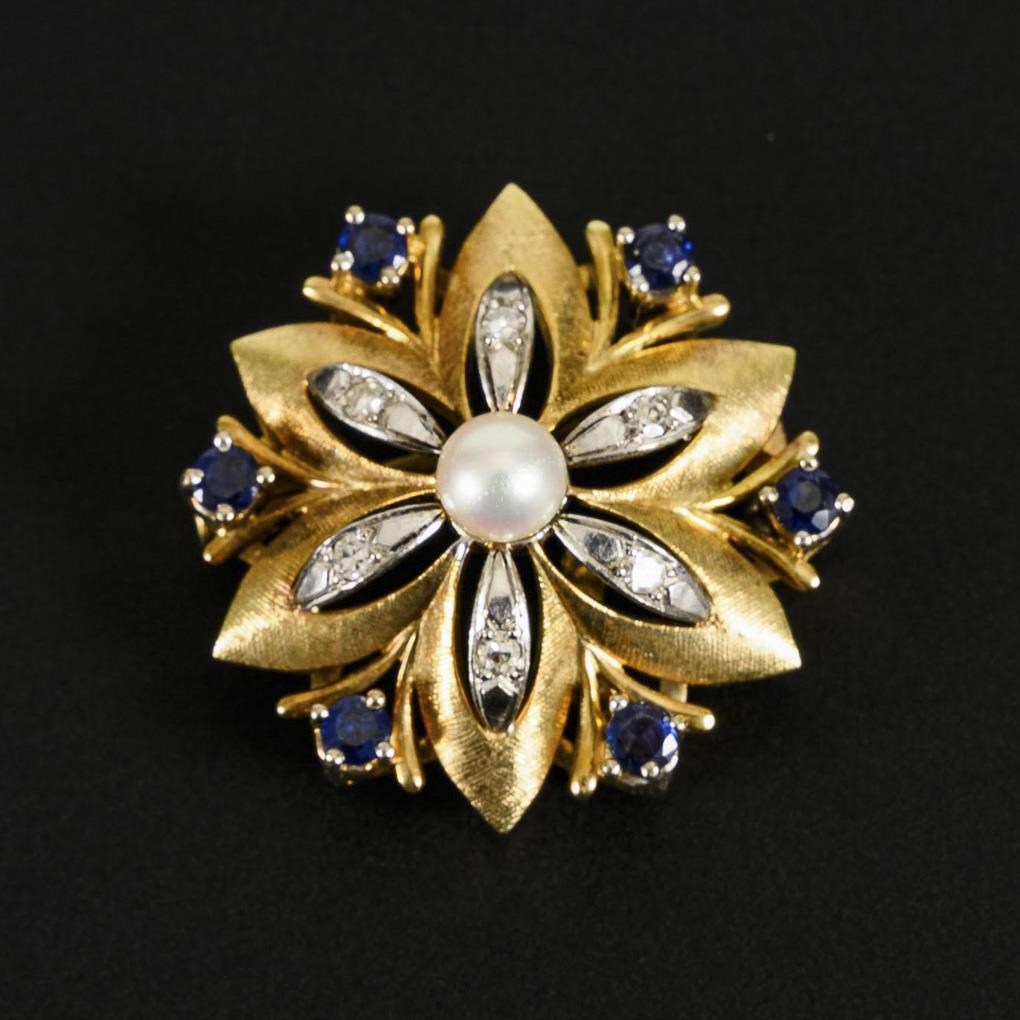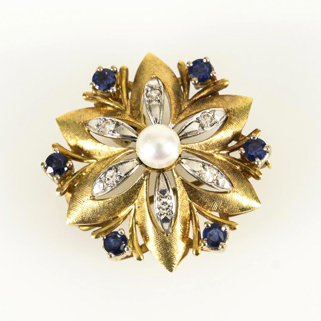 Plastische Blüte mit Zuchtperle, 6 chatongefassten Saphiren und 6 kleinen Diamanten. Schiebehaken, Scharnieröse.