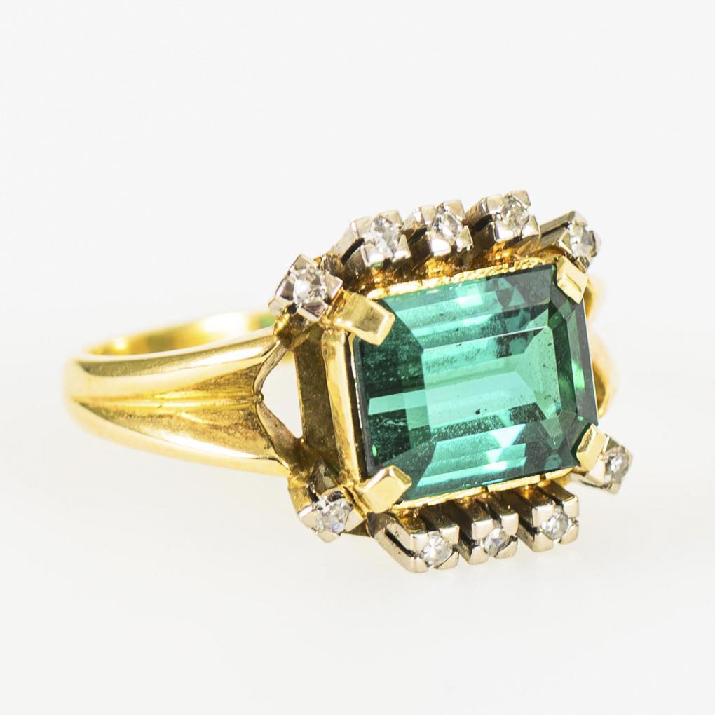 Krappengefasster Stein (Turmalin?), umgeben von 10 chatongefassten Kleinstdiamanten, zwischen mittlerer Schiene.
