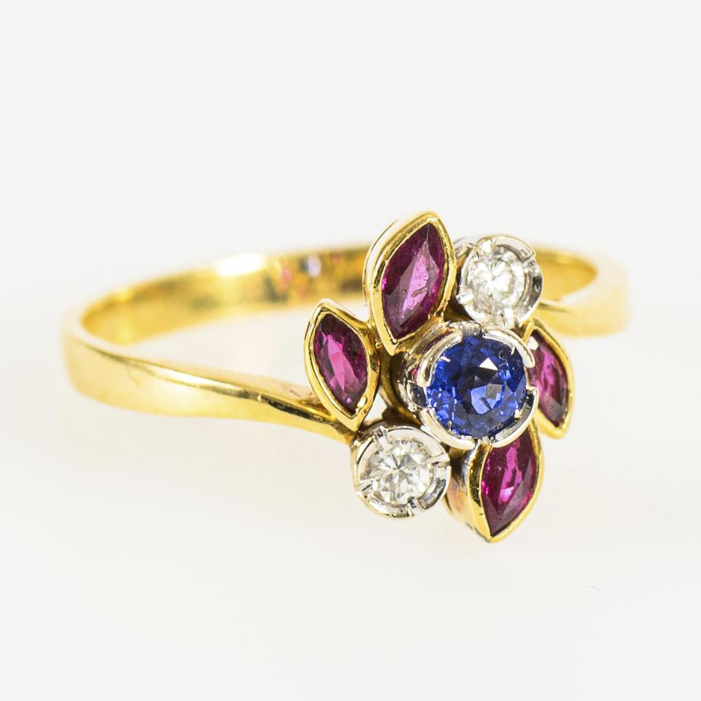 Ring mit Saphir, Rubinen und Brillanten.