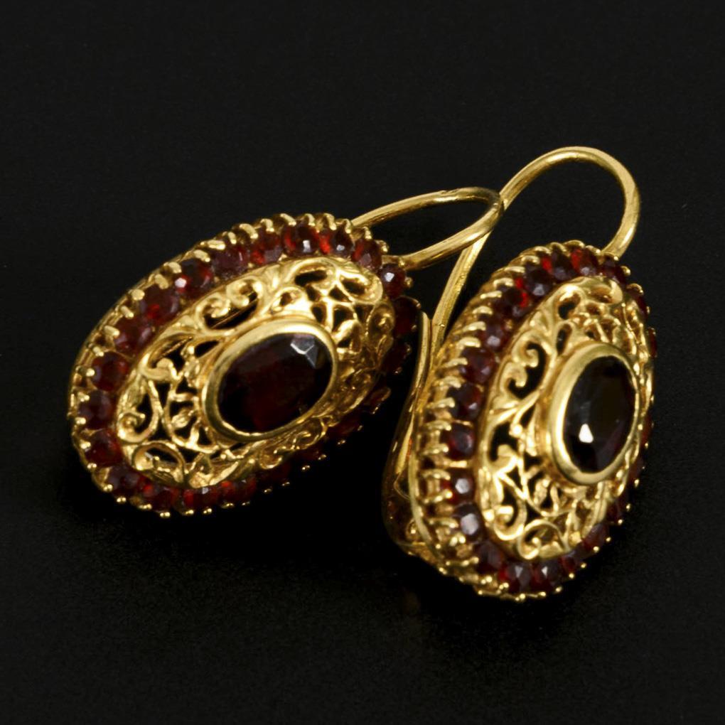 Durchbrochene Brisur mit zargengefasstem Granat, umringt von eingelassenen kleineren Steinen. Großer Federbügel.