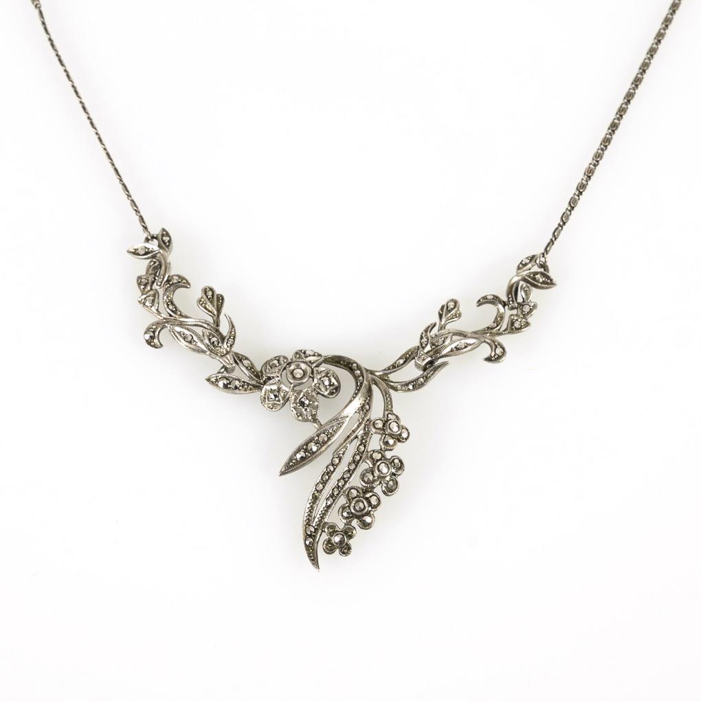 Florales, markasitbesetztes Schauteil zwischen Ziergliederkette mit Ringfederschließe.