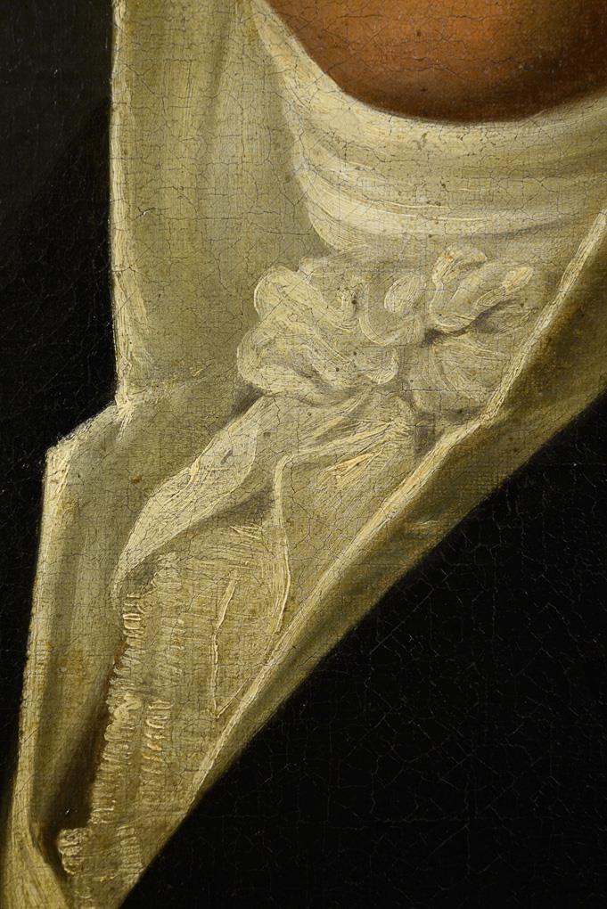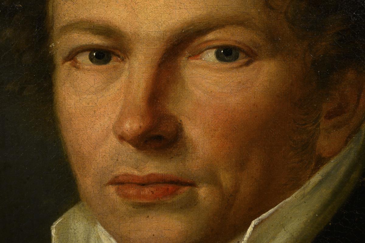 Qualitätvolles Bildnis eines Mannes mit lockigem Haar, weißem Hemd mit Stehkragen und schwarzem Gehrock vor wolkigem Himmel, der ein wenig an Wilhelm von Humboldt erinnert. Altersspuren.