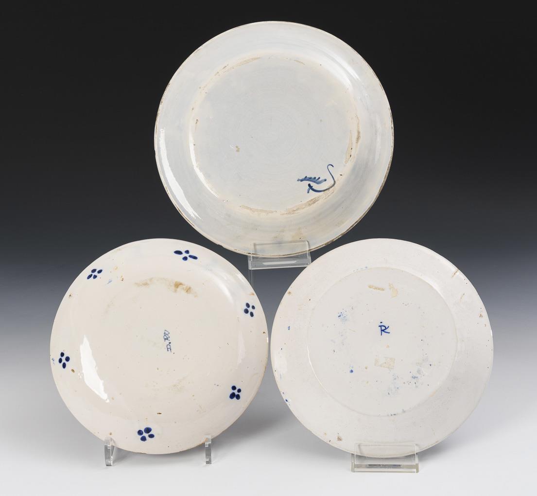 3 Delfter Fayence-Wandteller mit polychromer Bemalung.