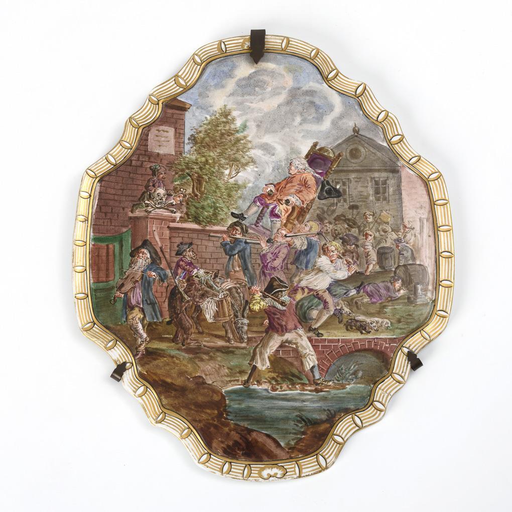 Geschweifte Platte mit dem karikierten Motiv eines Volksaufstands. Mit Aufhängung. Platte geklebt, goldberieben.