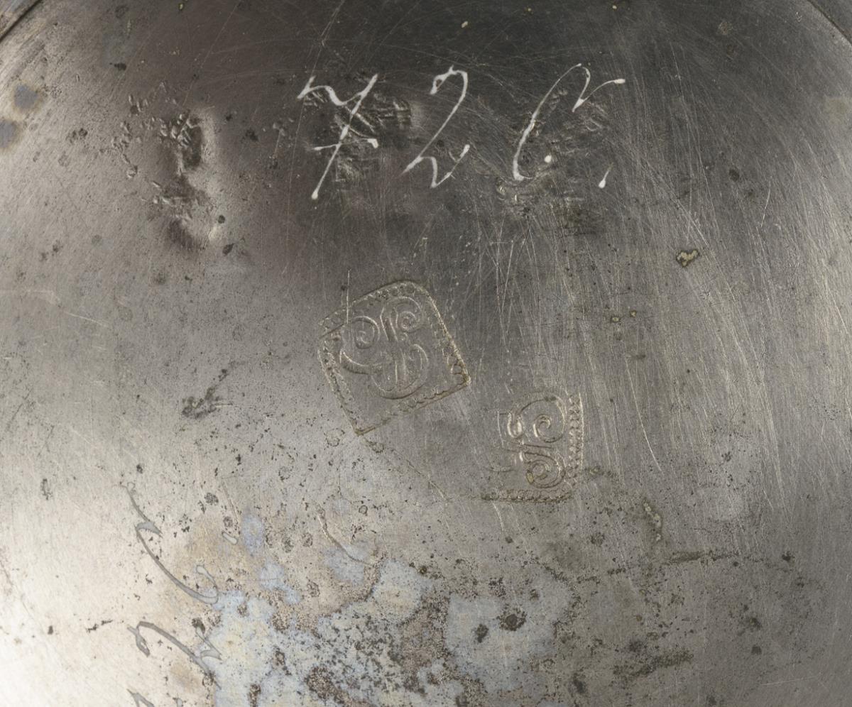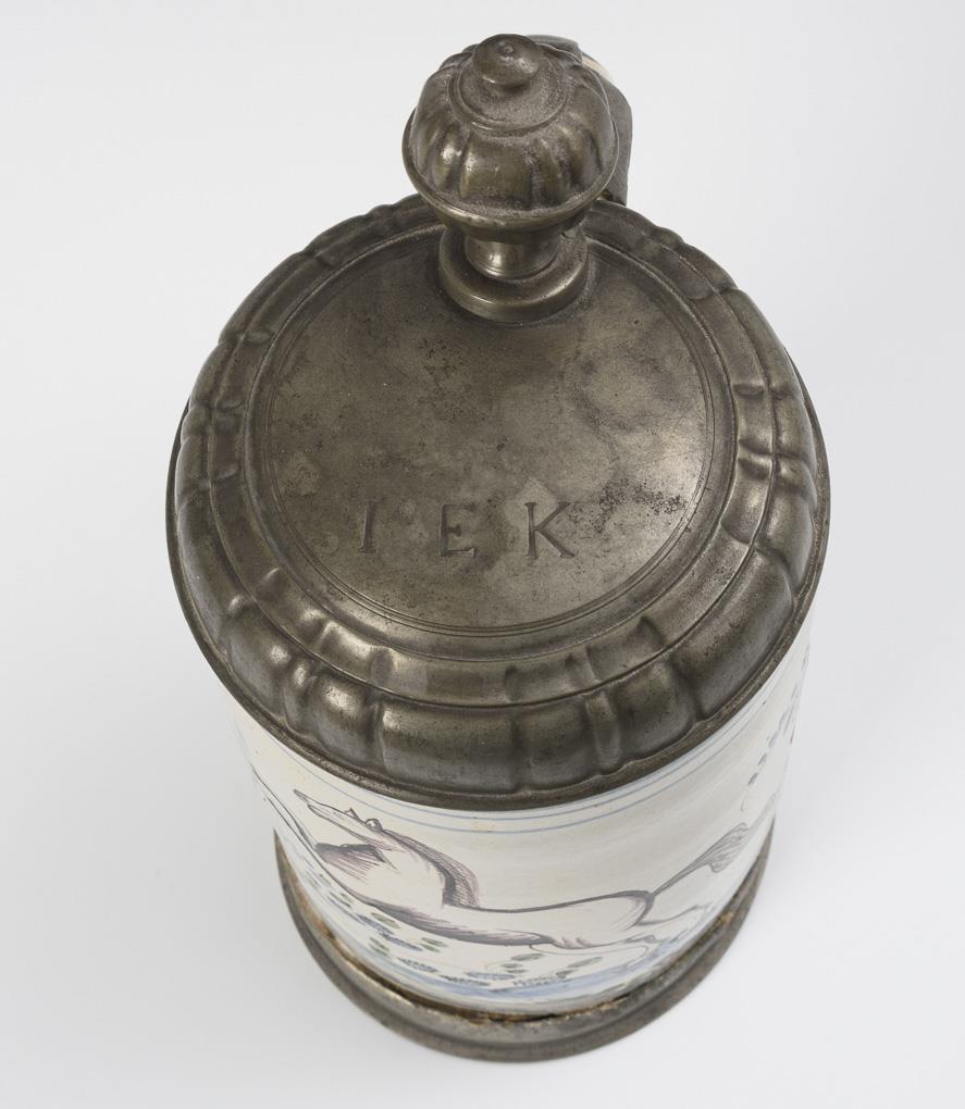 Zylindrischer Korpus mit Bandhenkel, schauseitig ein springendes Pferd zwischen Blumenstücken. Profilierter Zinndeckel mit Kugeldrücker, graviert "IEK", Zinnstandring und Henkelband. Glasurdefekte und Bestoßungen, Risse, Zinn mit leichten Defekten.