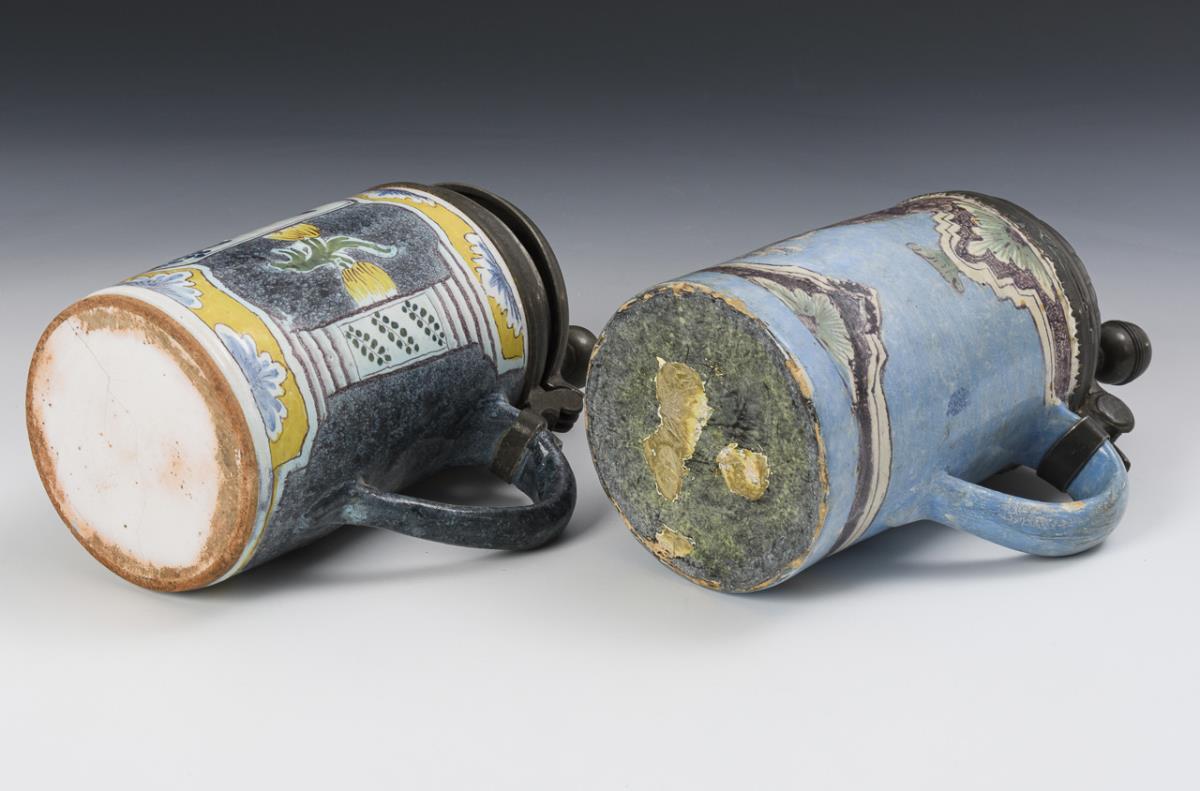 Jeweils zylindrischer Korpus mit Bandhenkel, 1x Pilasterdekor mit Blumenmalerei, 1x unscharfe Barockreserve mit Floralmotiv. Jeweils mit Zinndeckel und Kugeldrücker, graviert "EM 1754" und "JML 1780". Jeweils restauriert und mit Defekten.