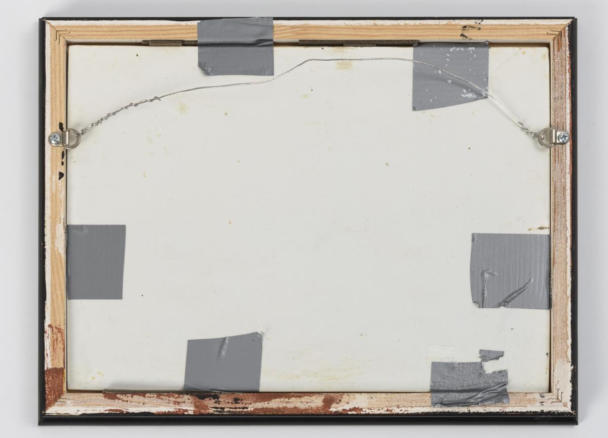 Fayence, weiß glasiert, farbig bemalt. Platte 22 x 30 cm, schwarzer Holzrahmen 26,5 x 34,5 cm.