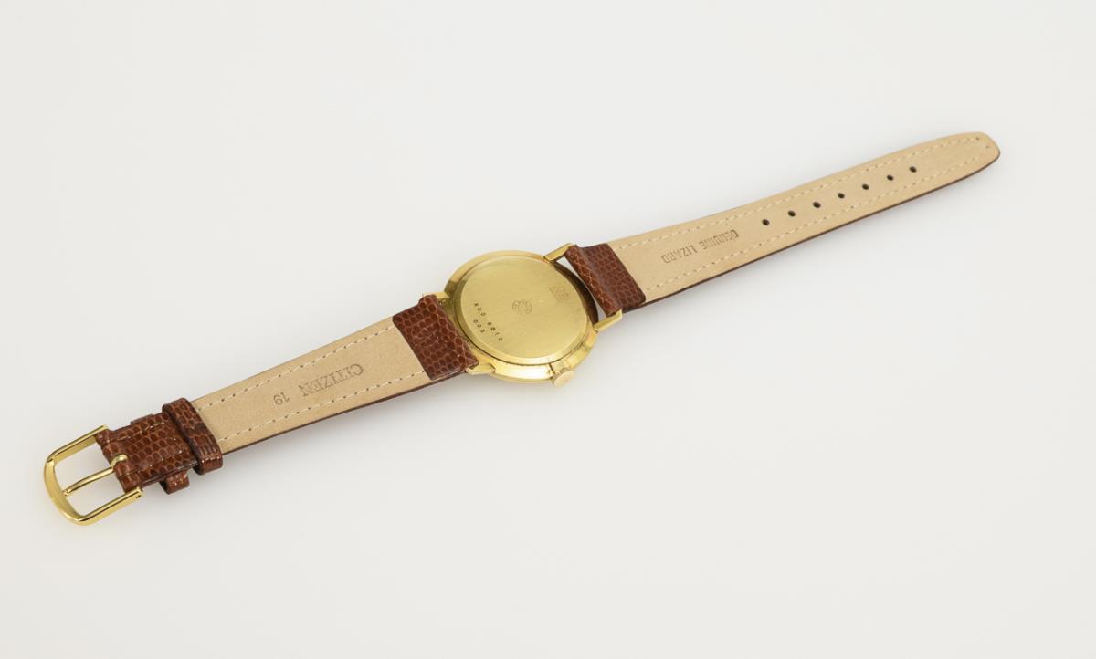 Federwerk mit Kronenaufzug. Im Kurzzeittest funktionstüchtig. Goldfarbenes Zifferblatt mit Stundenmarkierungen, Stabzeigern und Datumsanzeige bei der 3.